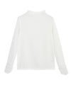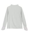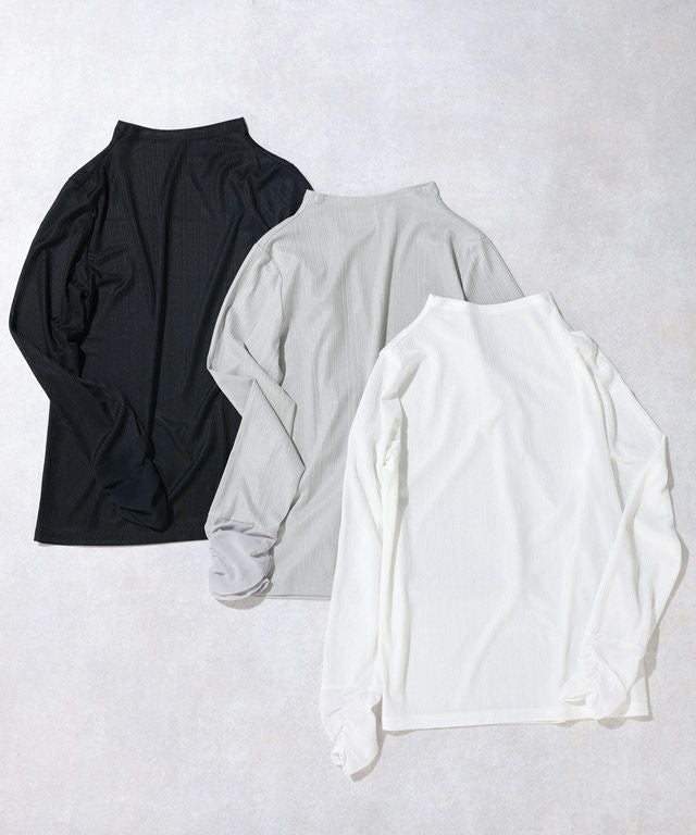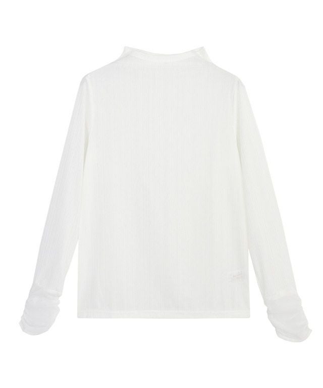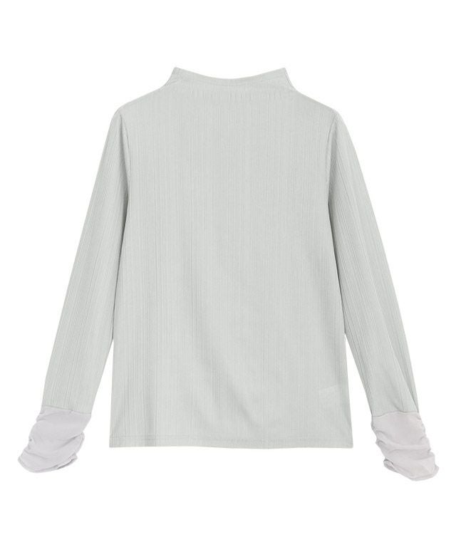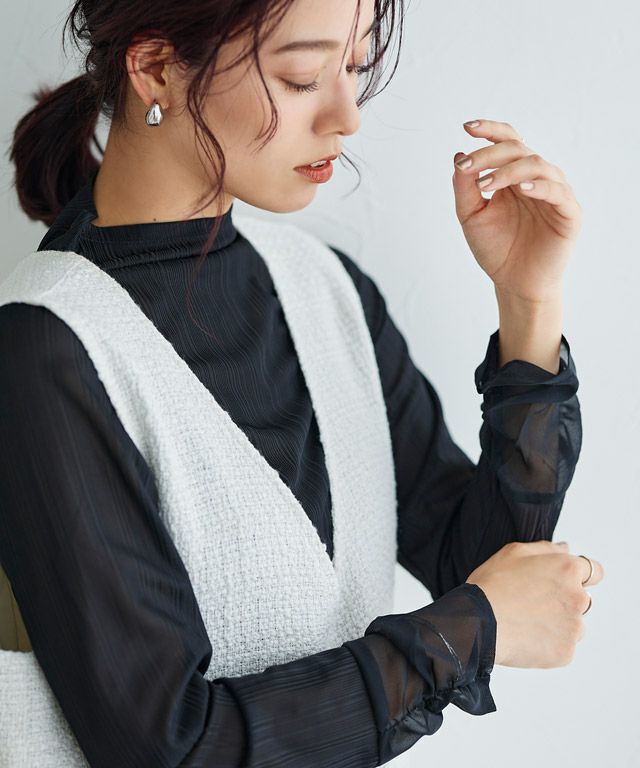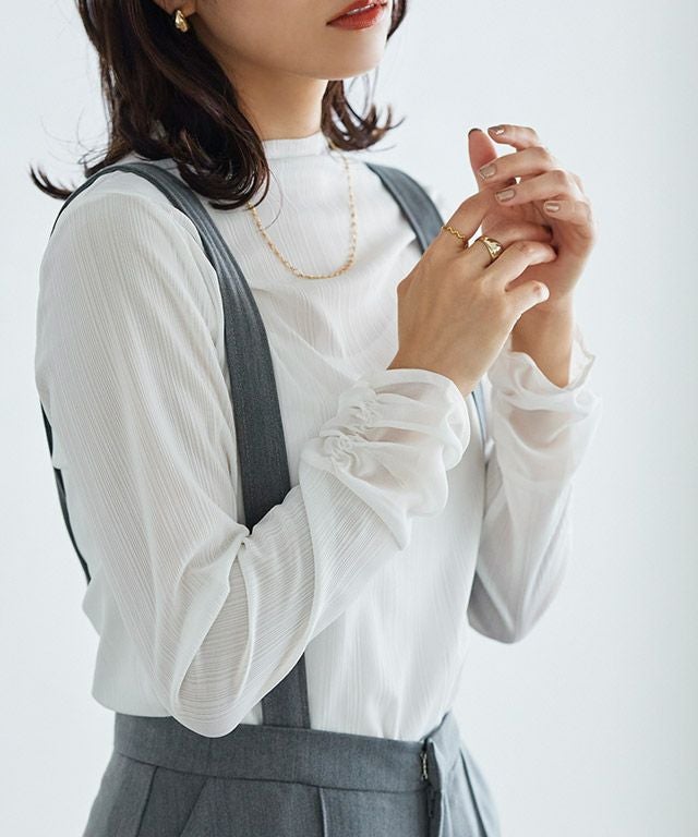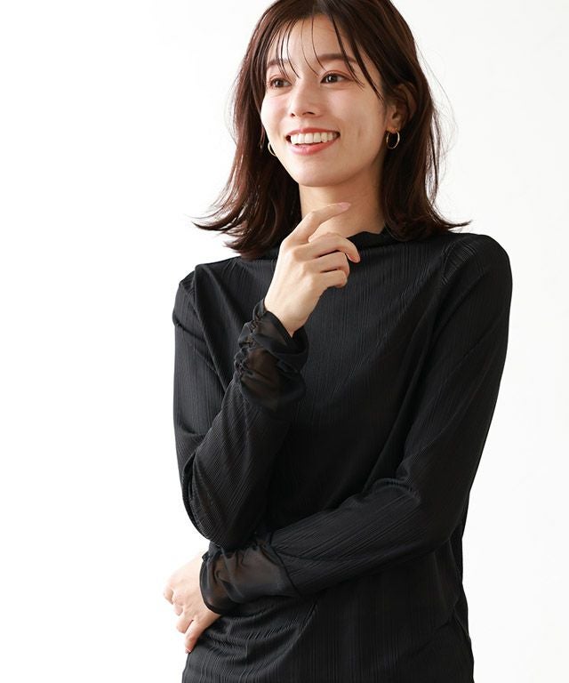 袖口には異素材感を持たせるシフォン素材。身頃は素肌がほんのり透ける、シアーな透明感が印象的なハイネックトップス。ストレッチの効いたリブ素材がサラッと肌になじみ、フィット感のあるシルエットに。