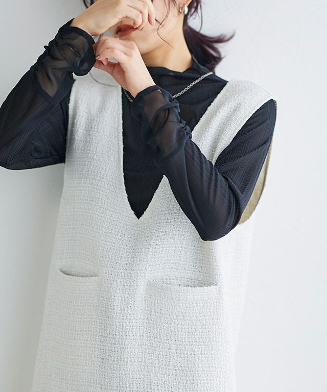 袖口はシフォン素材で切り替えを施しクシュッと軽やかに仕上げました。一枚での着用はもちろん、インナーとしても使えるのでシーズンを問わず活躍するアイテムです。
