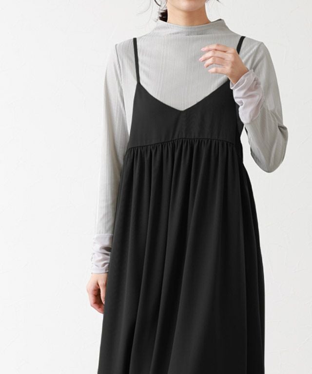 C 着丈はお尻が半分隠れる丈感でした。袖丈は手がちょうど隠れます。身幅はちょうど良いサイズでした。体のラインを拾いますが、生地に少し伸縮性があるので窮屈感はありませんでした。手首周りがシャーリングデザインでクシュッとなり可愛いです。ブラックでも程よく透け感があります。やや光沢感のある滑らかな生地で、手首周りは柔らかなシフォン素材でした。