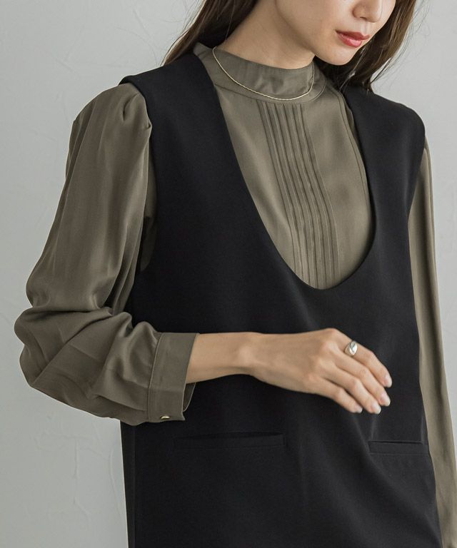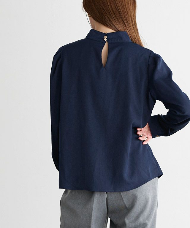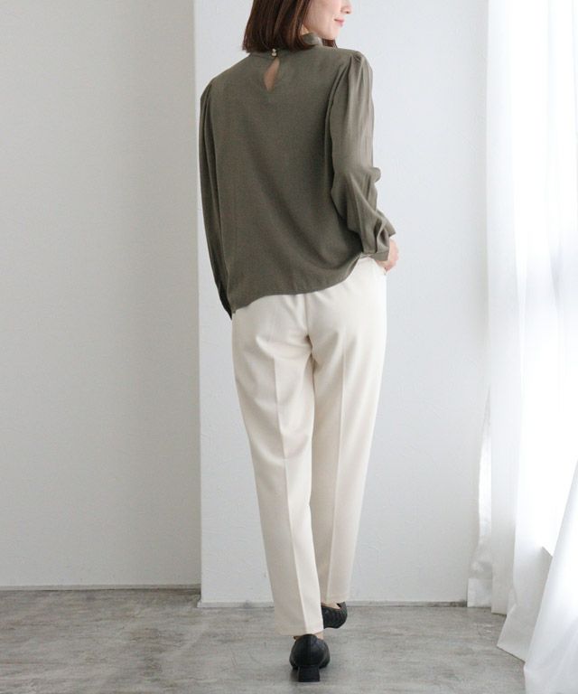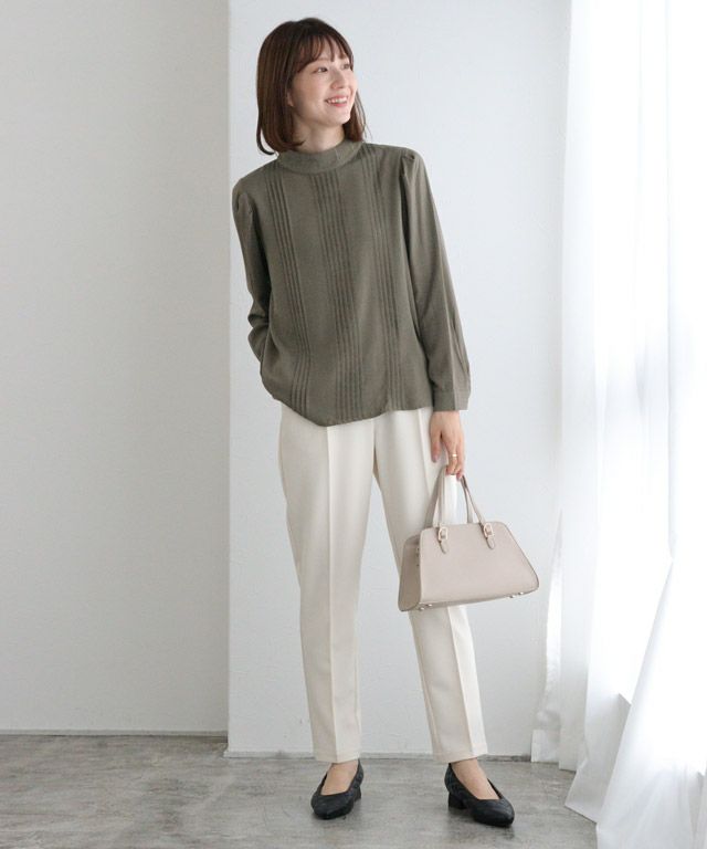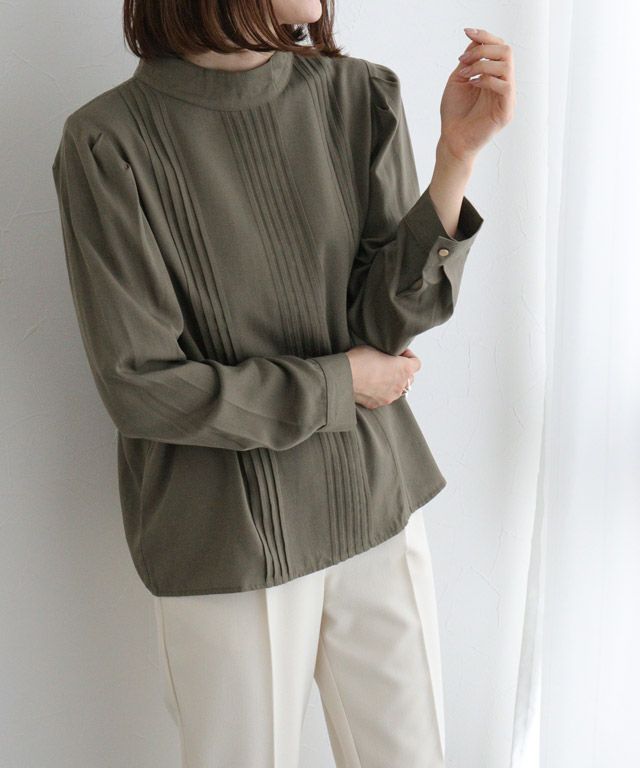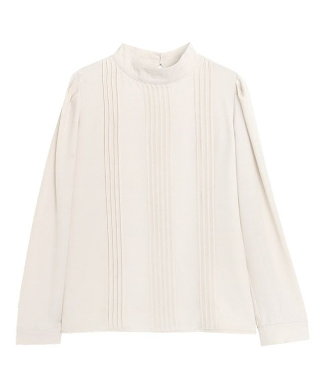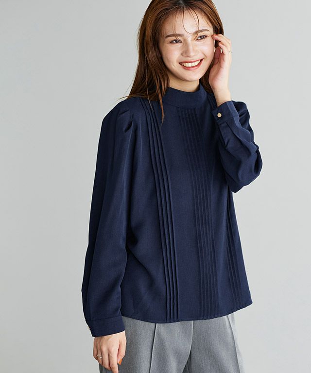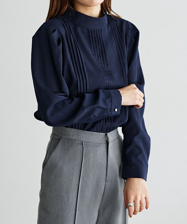 上品なスタイルを完成する“ピンタックハイネックブラウス”