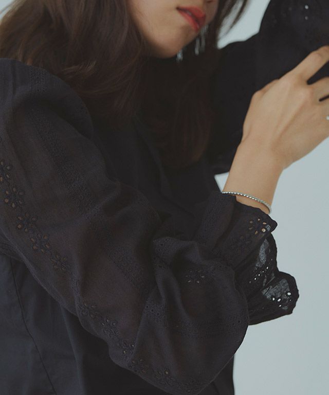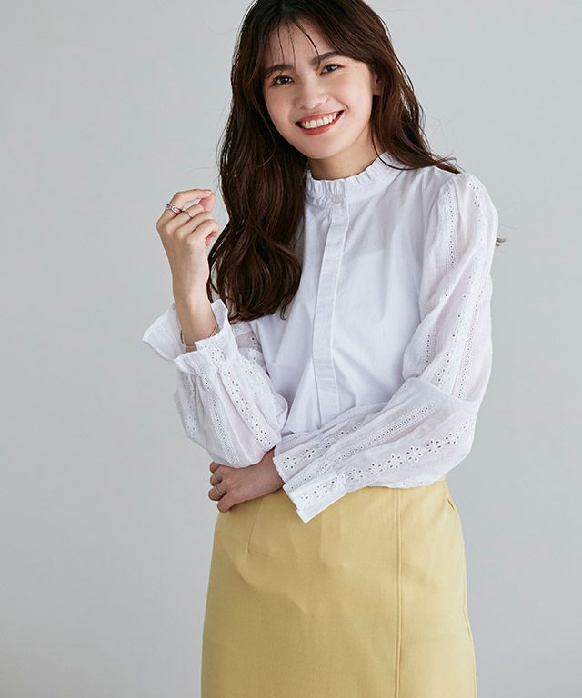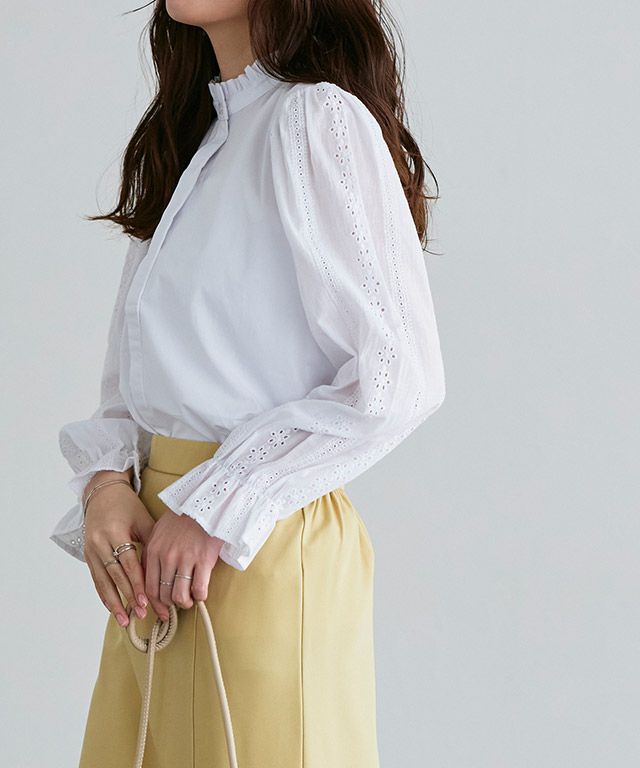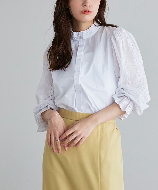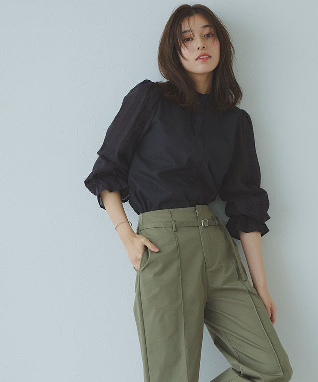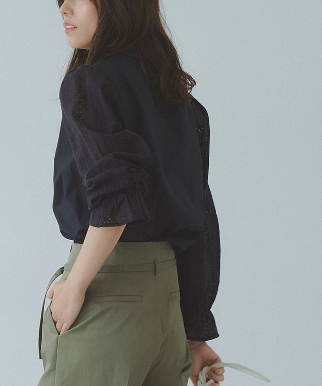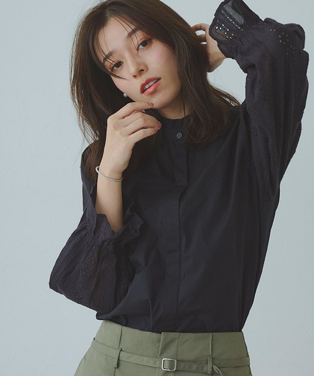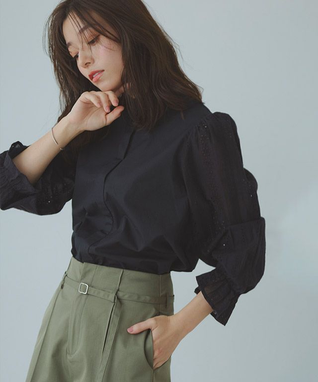 袖に施したレースと印象的なフリル襟が、華やかな印象に導くデザインブラウス。程良くボリュームのあるキャンディスリーブが女性らしさを高めてくれます。身頃は比翼デザインですっきりとメリハリのあるバランス感に。