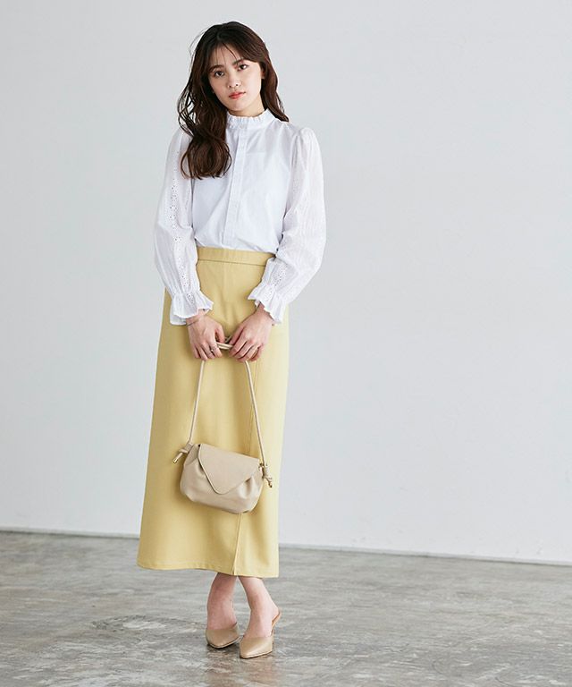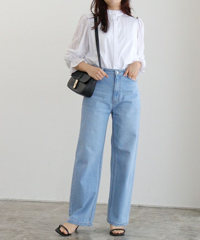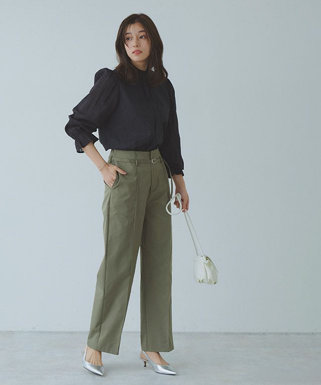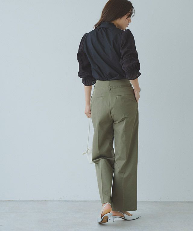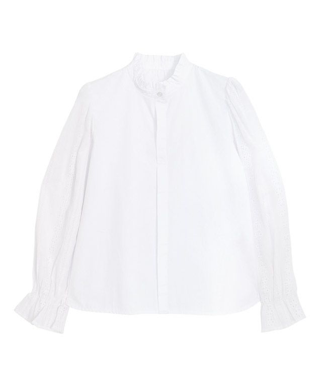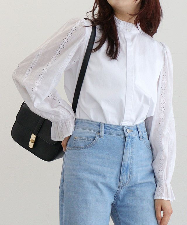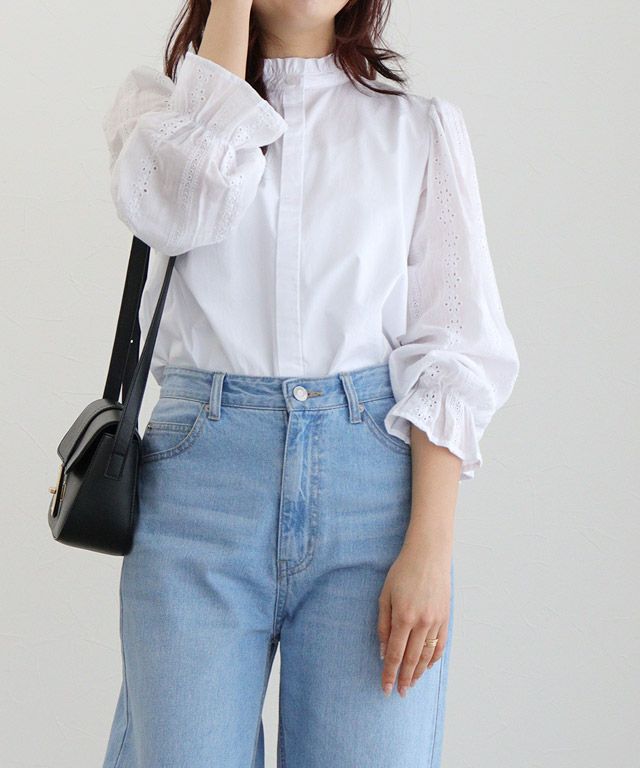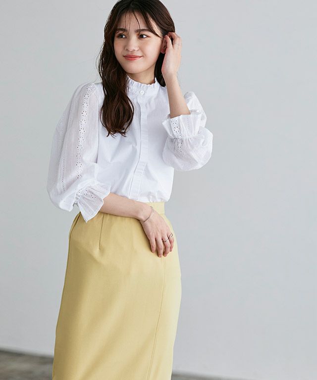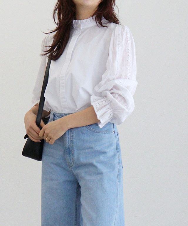 袖に施したレースと印象的なフリル襟が、華やかな印象に導くデザインブラウス。程良くボリュームのあるキャンディスリーブが女性らしさを高めてくれます。身頃は比翼デザインですっきりとメリハリのあるバランス感に。