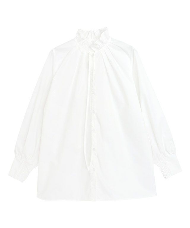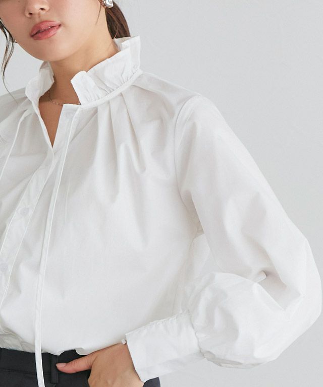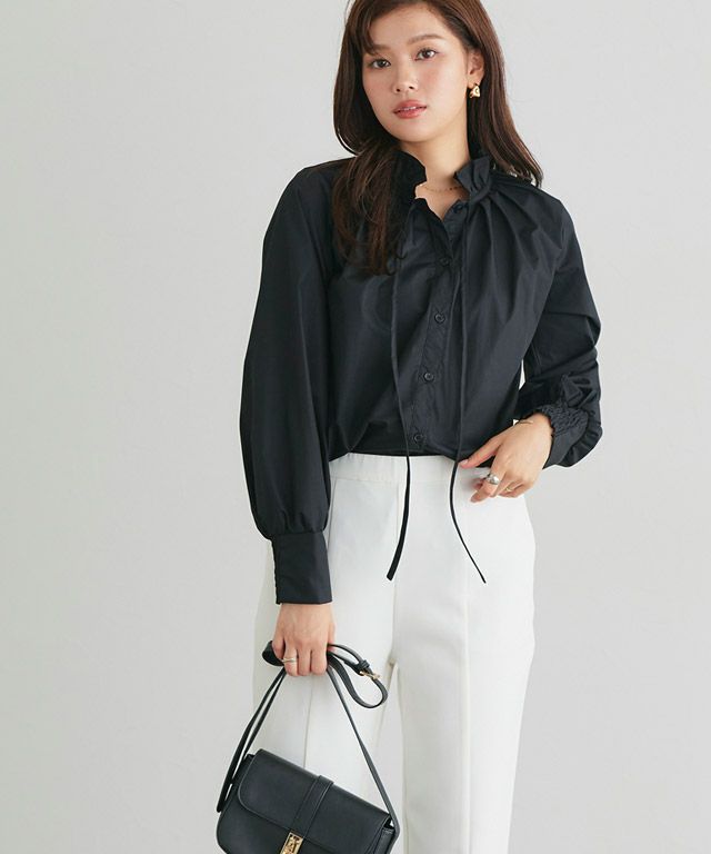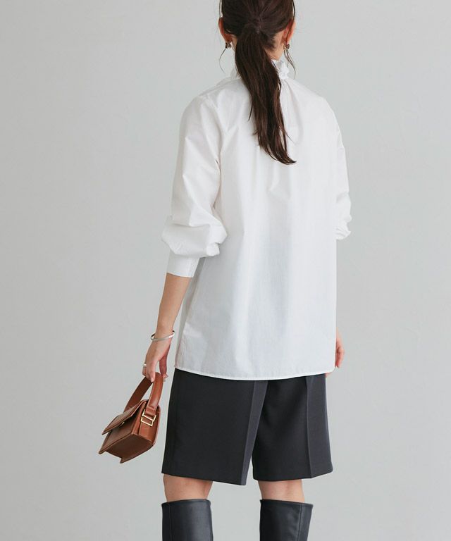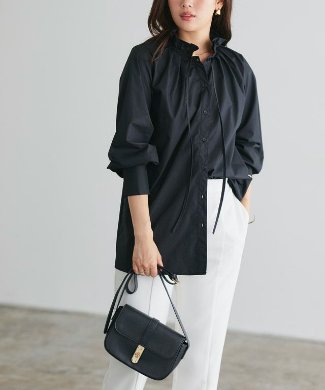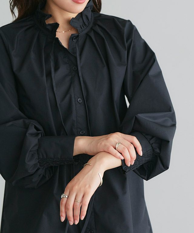 顔周りを華やかな印象へと導くスタンドフリルカラー。長めの着丈が体型カバーをしてくれるので、さらっと着用していただけます。袖デザインはややボリューム感を持たせ、袖口をシャーリングカフスにすることで、上げ下ろしをしやすいのもこだわりポイント。