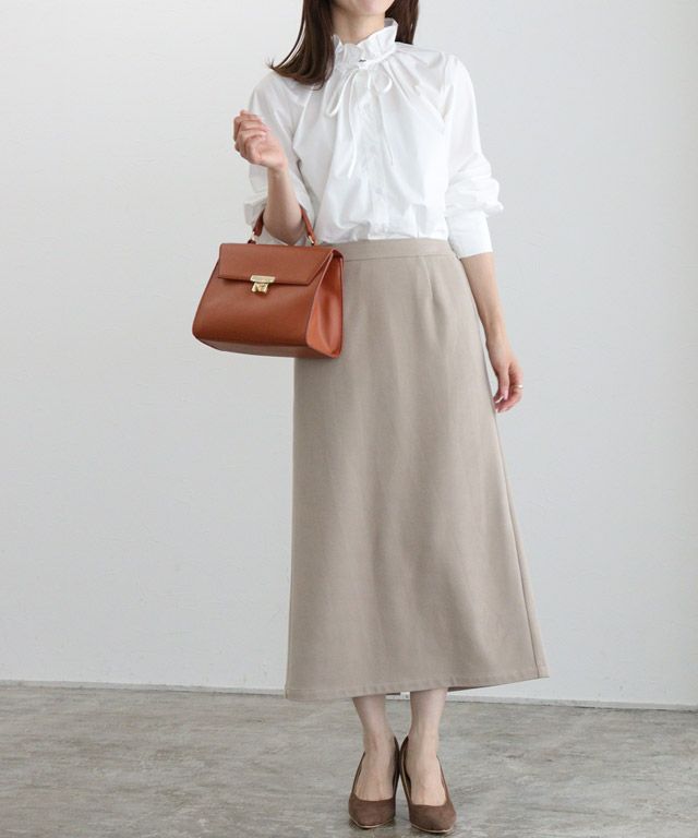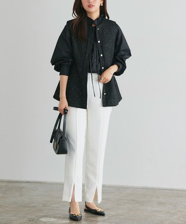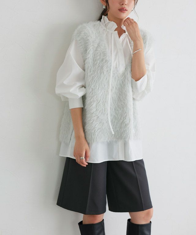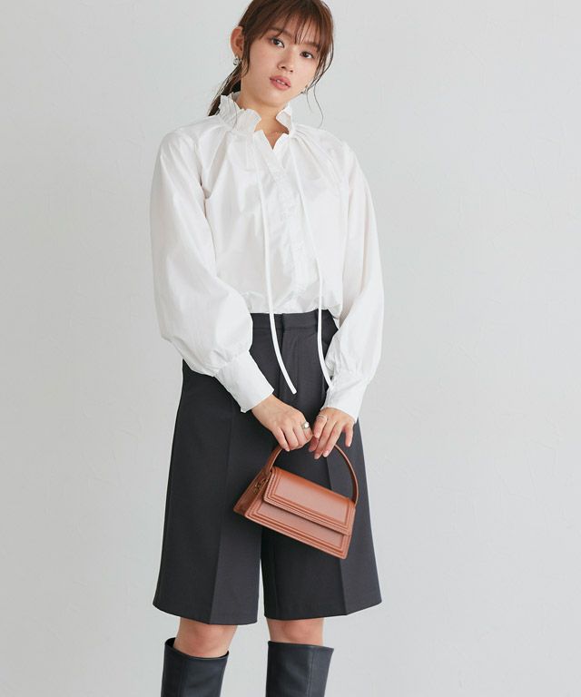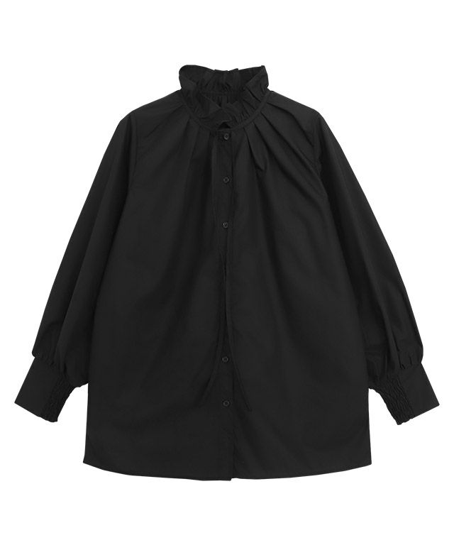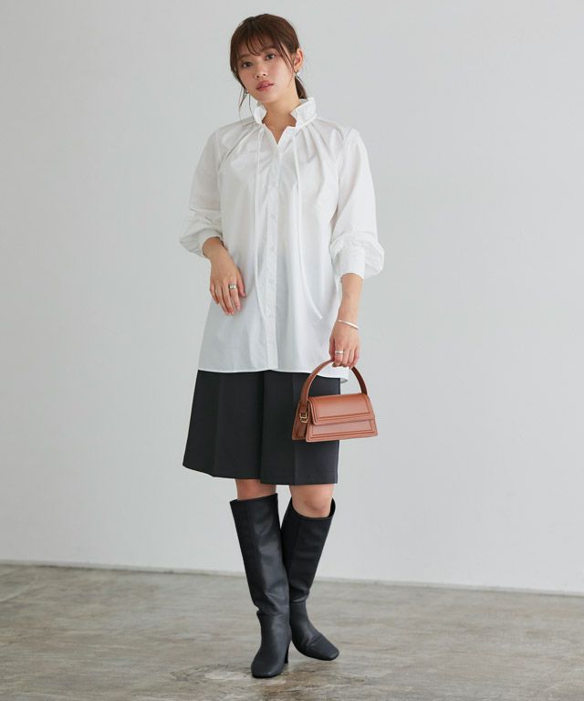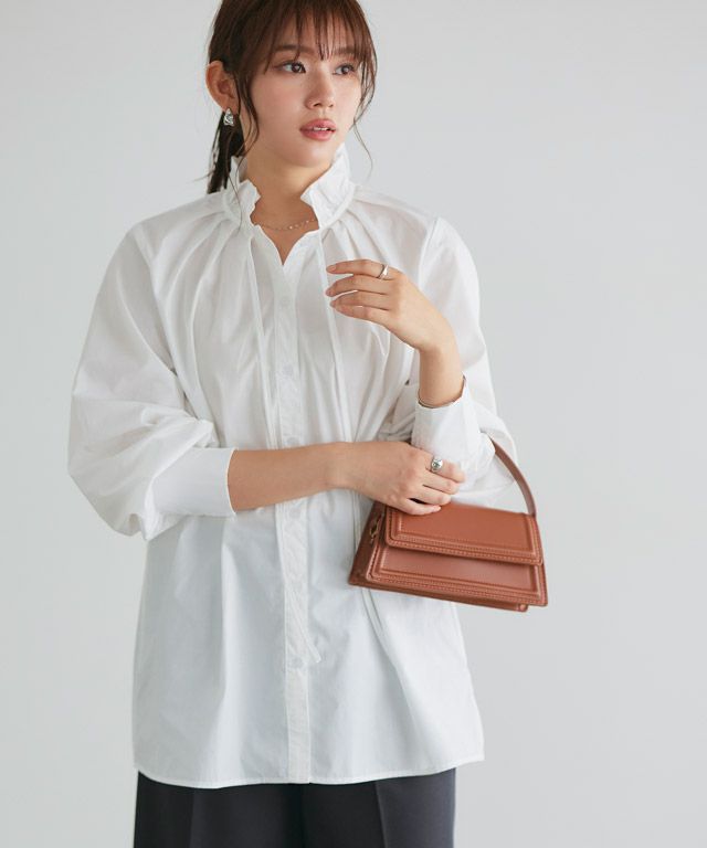 顔周りを華やかな印象へと導くスタンドフリルカラー。長めの着丈が体型カバーをしてくれるので、さらっと着用していただけます。袖デザインはややボリューム感を持たせ、袖口をシャーリングカフスにすることで、上げ下ろしをしやすいのもこだわりポイント。
