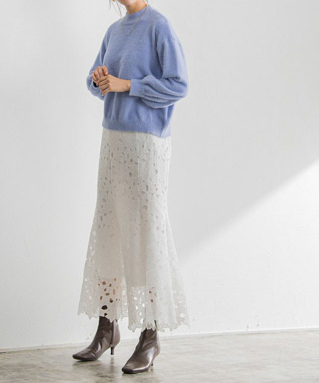 ふわふわのシャギー素材がふんわり柔らかな印象へと導きます。チクチク感のない包み込まれるような心地よい着心地も魅力の一つ。