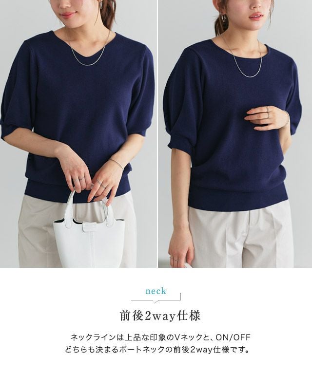 パフスリーブとシンプルな身頃で、華奢見えするメリハリあるシルエットに。 ネックラインは上品な印象のVネックとON/OFFどちらも決まるボートネックの前後2way仕様。 袖は5分丈なので重くなりすぎず、スタイリングが完成します。