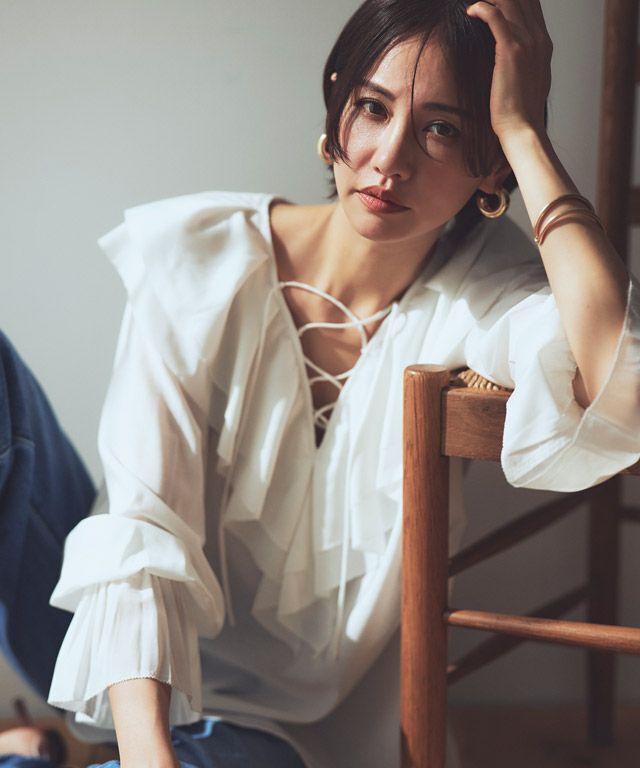 ボリュームのある二段に重なったフリルが顔周りを華やかに見せてくれる一枚。キャンディスリーブで女性らしさ溢れるデザインの中に、ざっくりと開いたvネックとレースアップのディティールが、抜け感とアクセントをプラスします。程よい透け感と相まってフェミニンになりすぎずこなれたスタイリングに仕上がります。