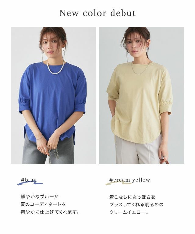 パフスリーブデザインにすることでカットソー素材でもフェミニンな印象に。後ろは長めの丈感なので気になるヒップ周りをカバーできるところも嬉しいポイントです。