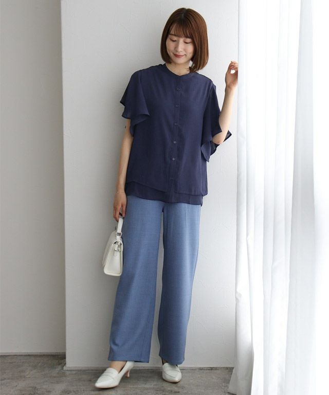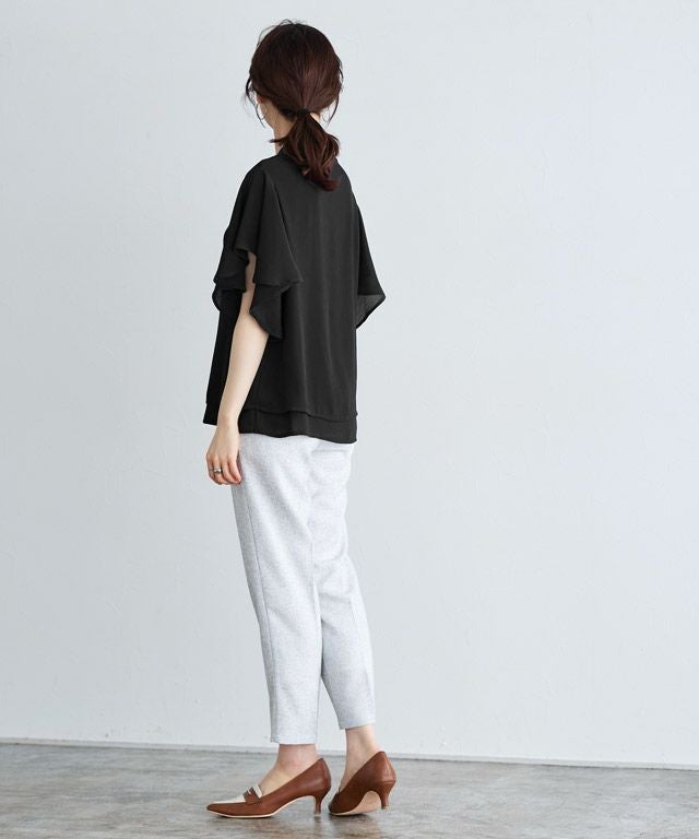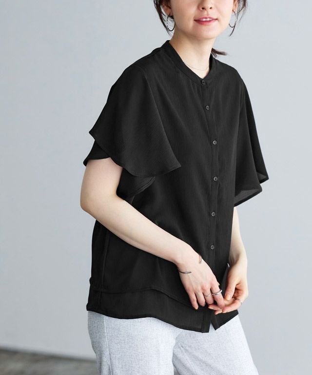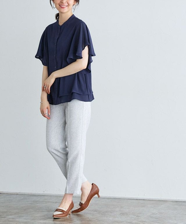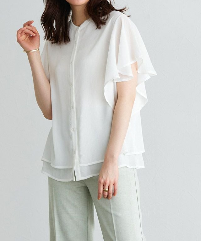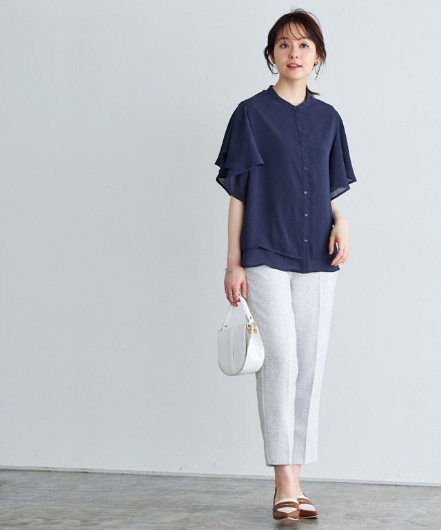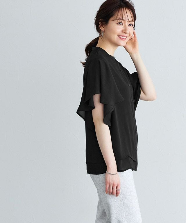 女性らしく華やかな印象を与えてくれるフレアデザイン。フレアスリーブは気になる二の腕を隠しつつ、華奢見せを叶えてくれます。裾は二枚仕立てのデザインをあしらい、一枚で着映え感のあるブラウスに仕上げました。