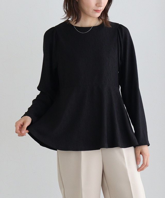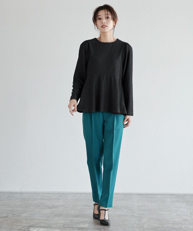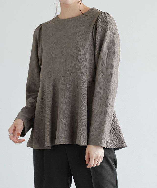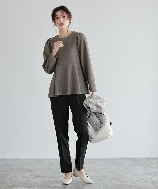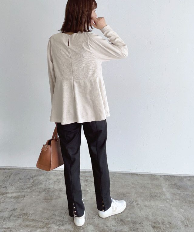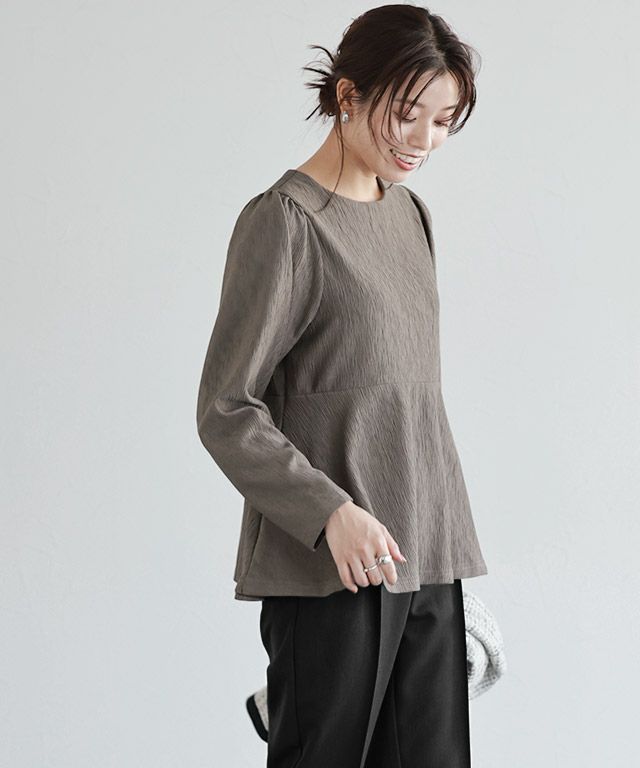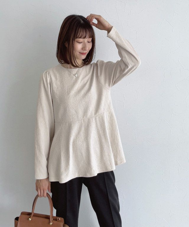 ウエストで切り替えたペプラムデザインが女性らしいトップス。裾に向かって広がる落ち着いたフレアラインで、甘すぎず大人な印象に仕上げました。華奢見えしながら、お腹周りを隠してくれるところも嬉しいポイント。細身ボトムスとの相性抜群です◎