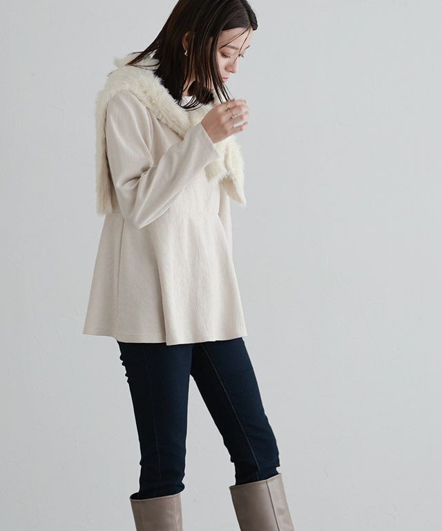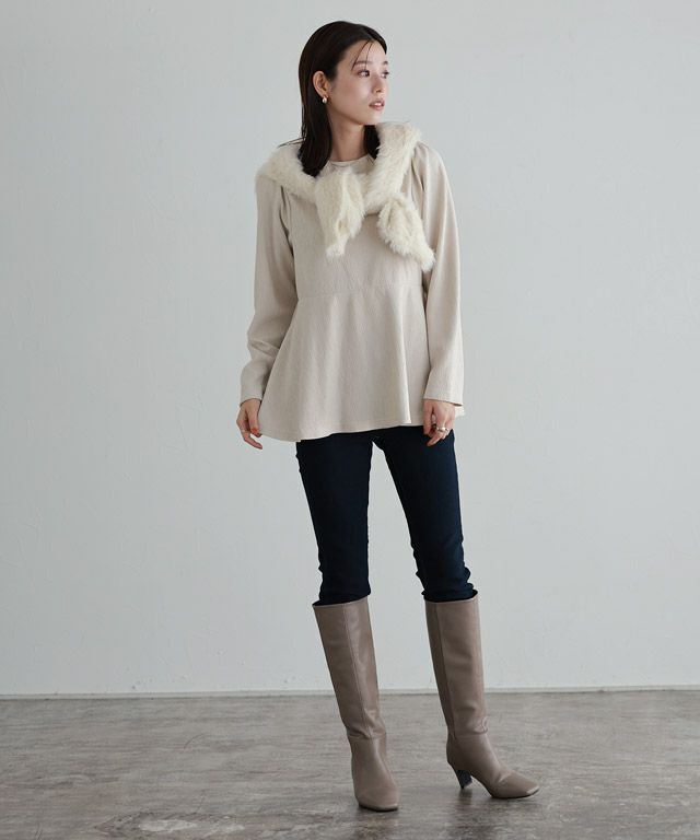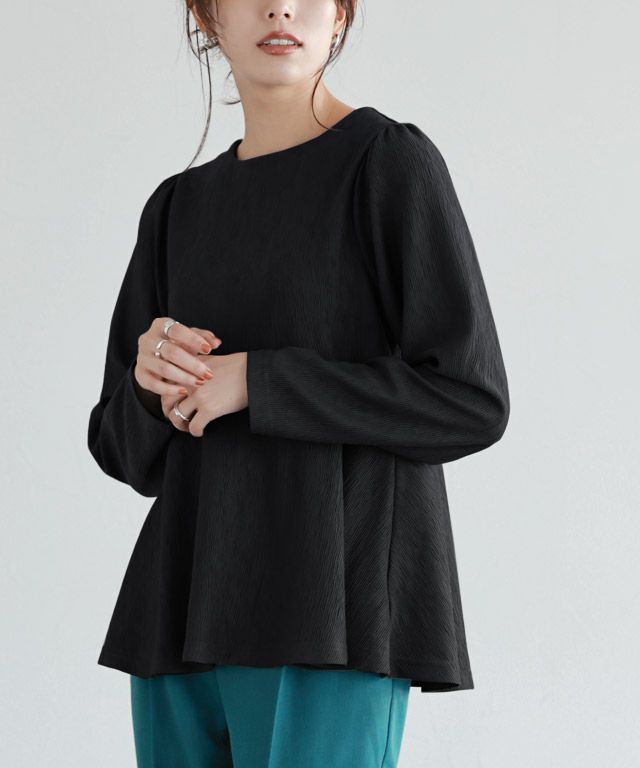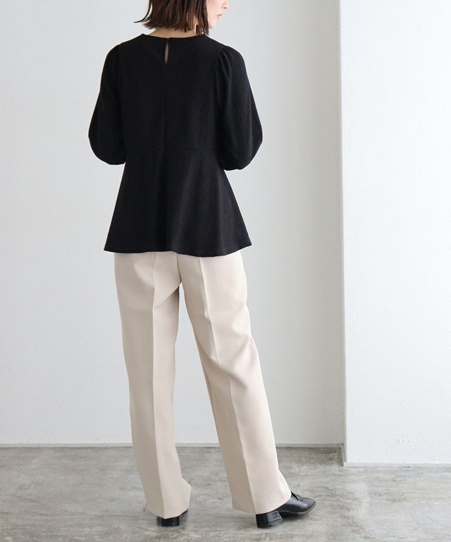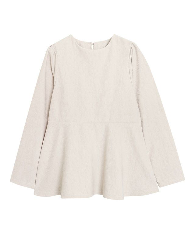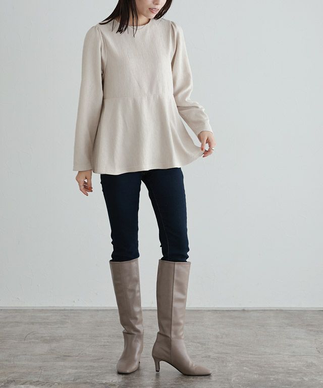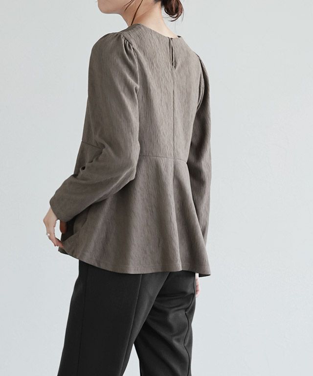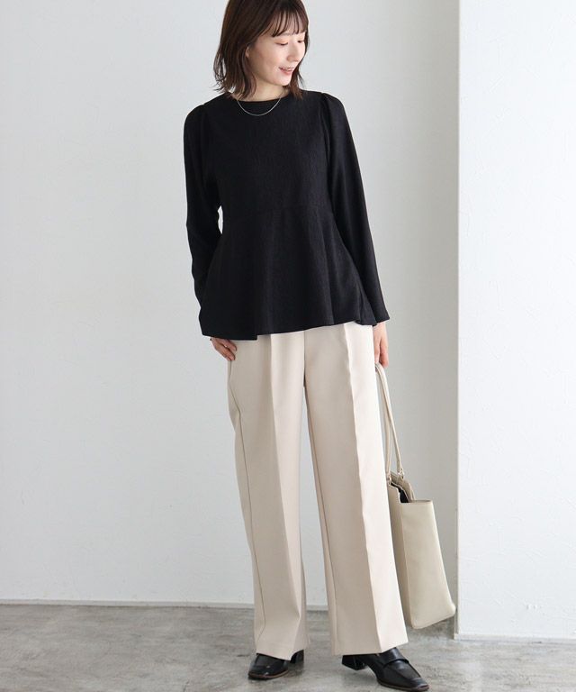 ウエストで切り替えたペプラムデザインが女性らしいトップス。裾に向かって広がる落ち着いたフレアラインで、甘すぎず大人な印象に仕上げました。華奢見えしながら、お腹周りを隠してくれるところも嬉しいポイント。細身ボトムスとの相性抜群です◎