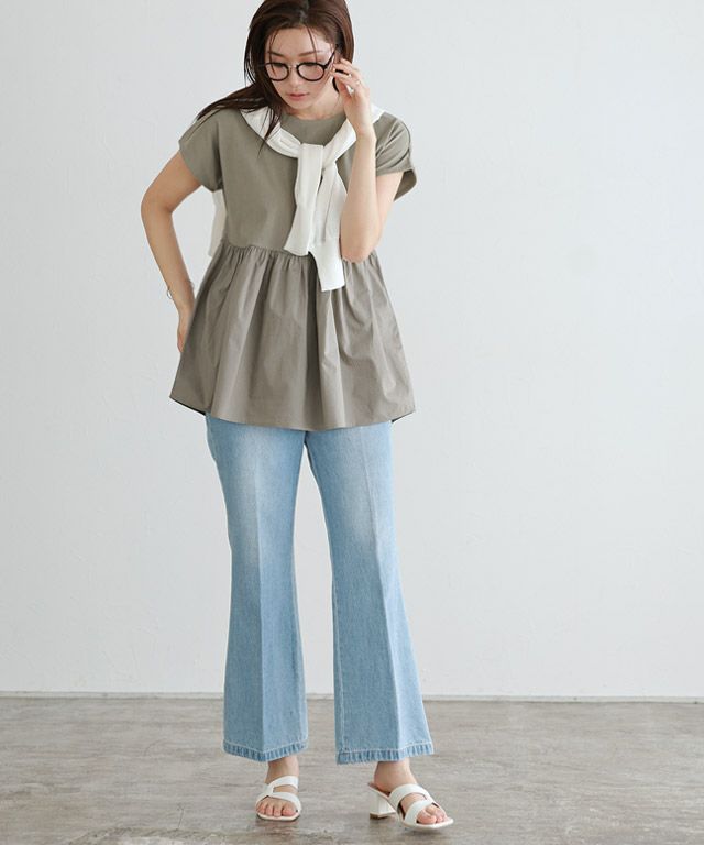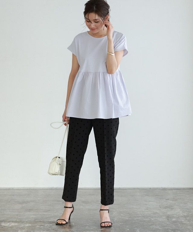 滑らかな表面感がカジュアルながらも上品な印象に。裾の布帛部分は、綿混素材で程よくハリがあり、綺麗なシルエットをキープしてくれます。