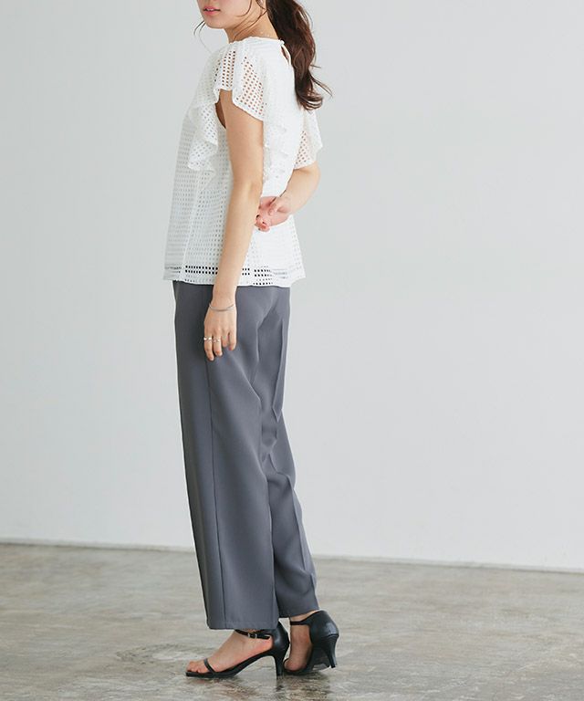 肩に施されたフリルがフェミニンなアクセントをプラス。程よいフリルの存在感が、シンプルながらもスタイリング全体に華やかさを与えてくれる一枚です。