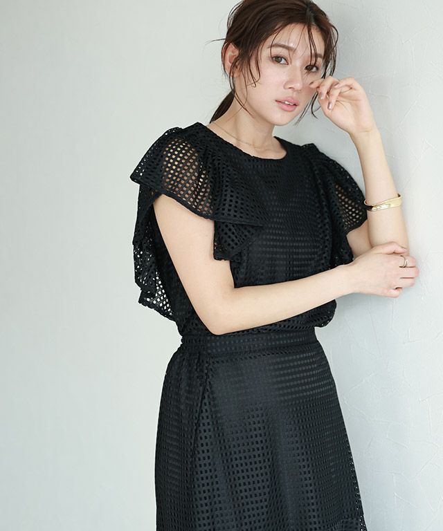 トレンド素材とデザインのミックス“メッシュフリルスリーブブラウス”