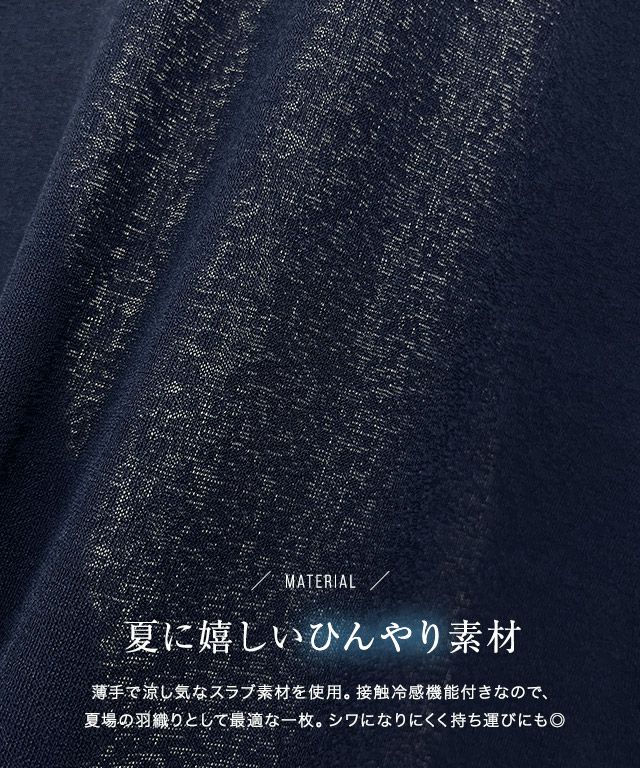 薄手で涼し気なスラブ素材を使用。接触冷感機能付きなので、夏場の羽織りとして最適な一枚。シワになりにくく持ち運びにも◎