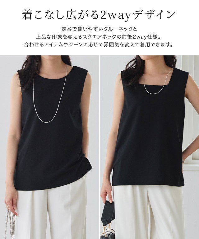 定番で使いやすいクルーネックと、上品な印象を与えるスクエアネックの前後2way仕様。合わせるアイテムやシーンに応じて雰囲気を変えて着用できます。ジャケットやシャツのインナーとして取り入れるだけで、トレンド感のあるスタイリングが完成します。