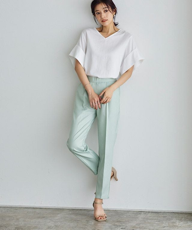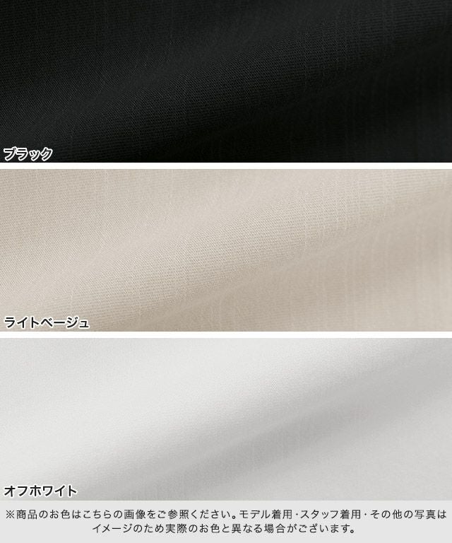 リネンのような風合いで縦スラブの素材がシーズンムード高めてくれる一枚。さらっと軽やかな素材が魅力的で涼しげな印象を叶えます。