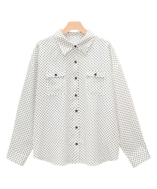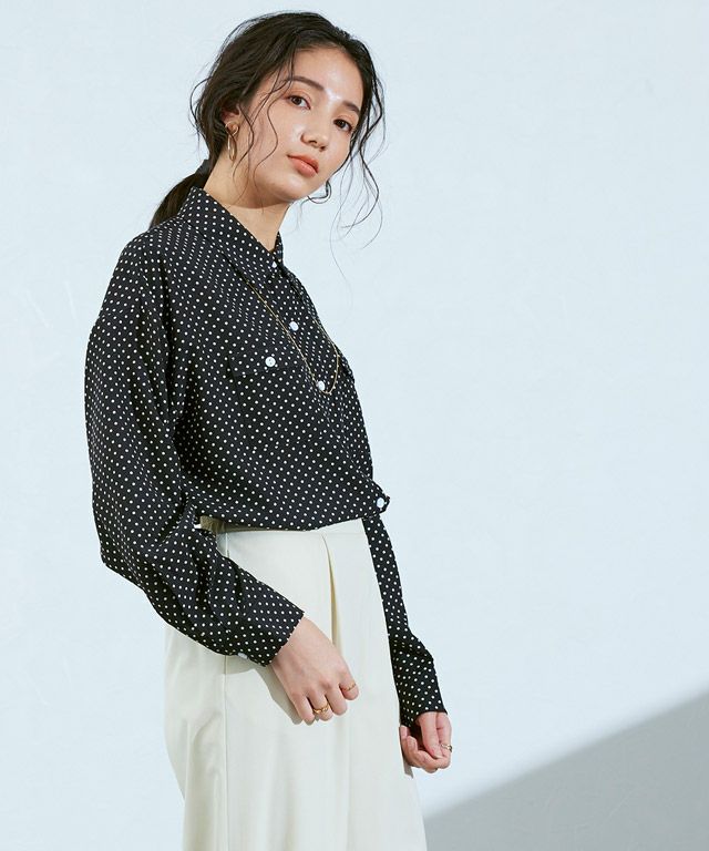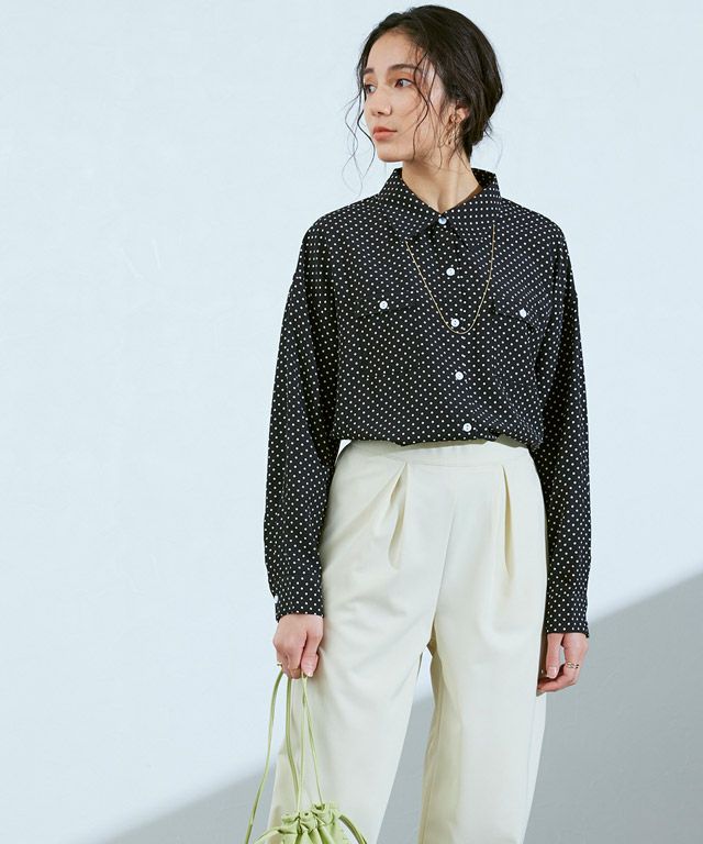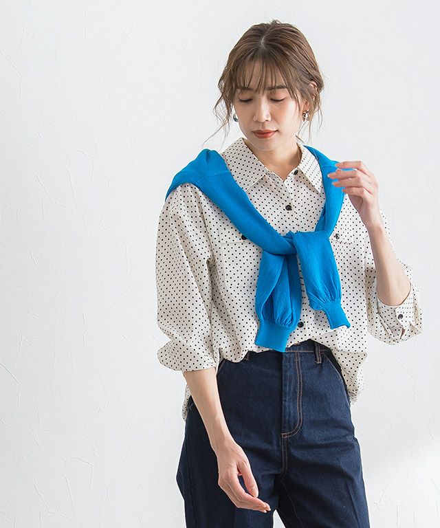 程良くゆとりのあるサイジングと落ち感が相まって女性らしい雰囲気に◎胸ポケットデザインやボタンをドットのカラーと同色に合わせたりとシンプルながらもこだわりのある一枚に仕上げました。