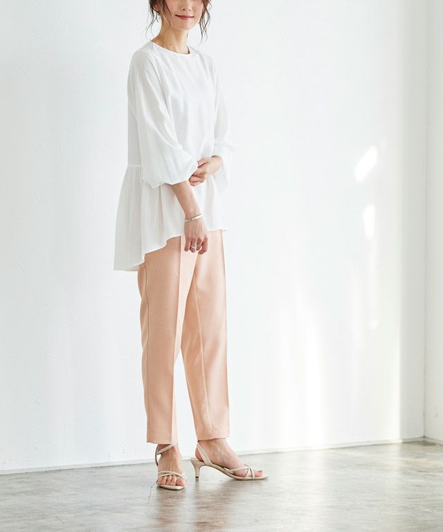 後身頃にギャザーを施すことで大人フェミニン仕上げに。袖も程よくボリューム感を持たせることで、女性らしさもプラスしてくれます。