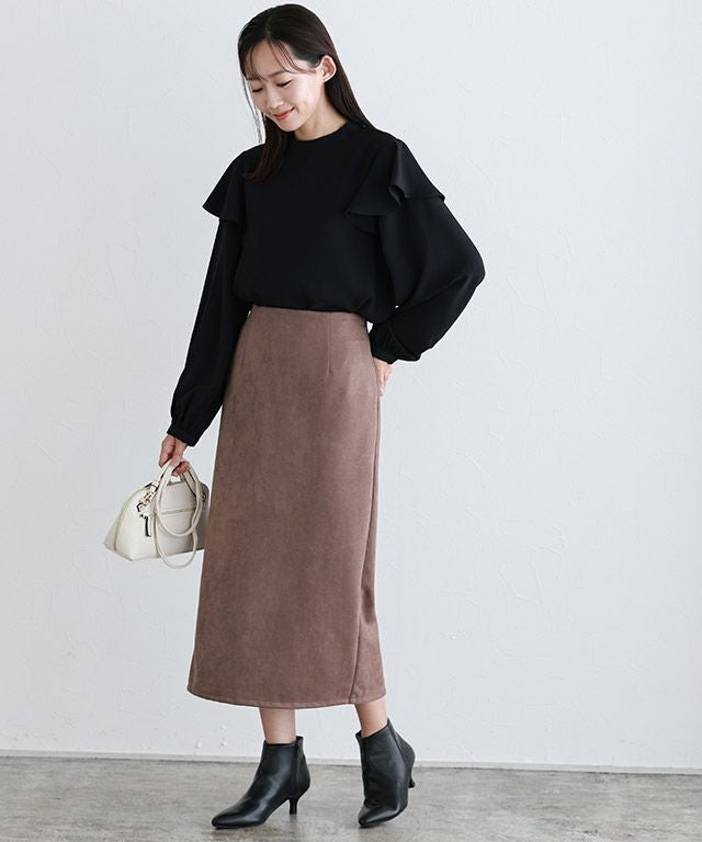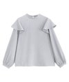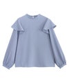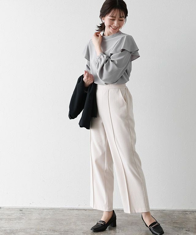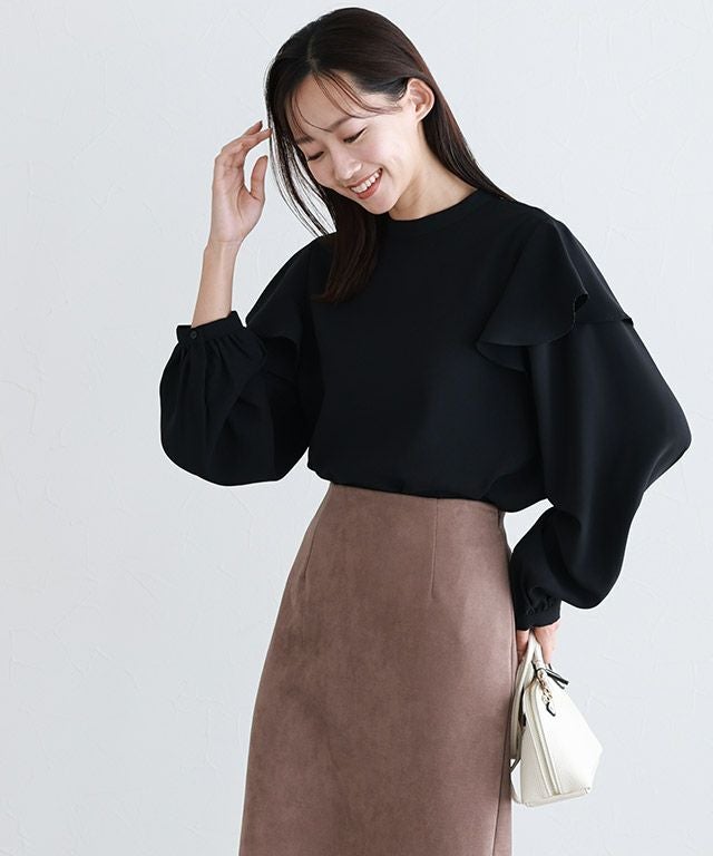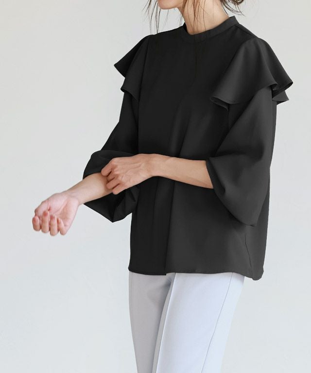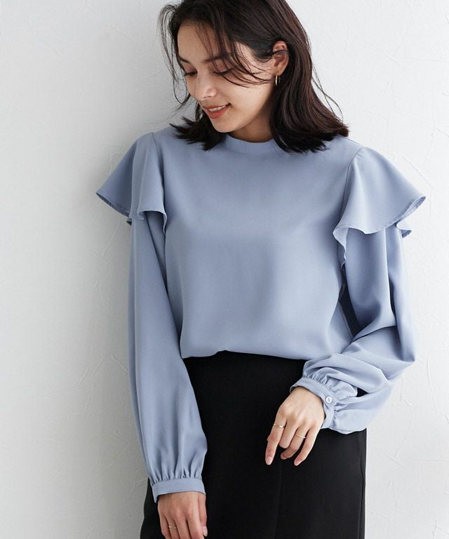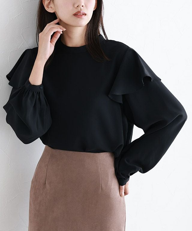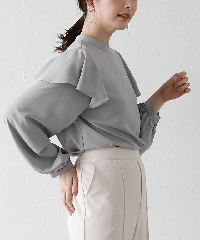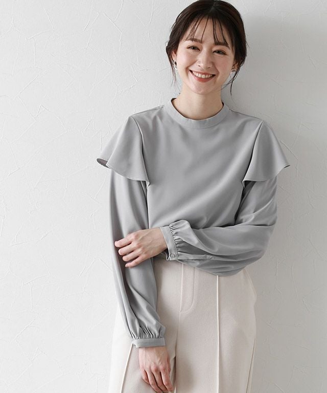 肩に施されたフレアデザインが大人可愛いブラウス。シンプルなデザインながらもフェミニンなアクセントをプラスしてくれます。ハイネックできちんと感もあり、ON/OFF問わず着用していただけます。