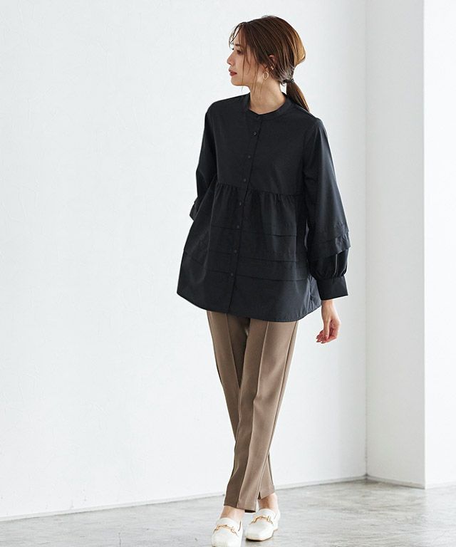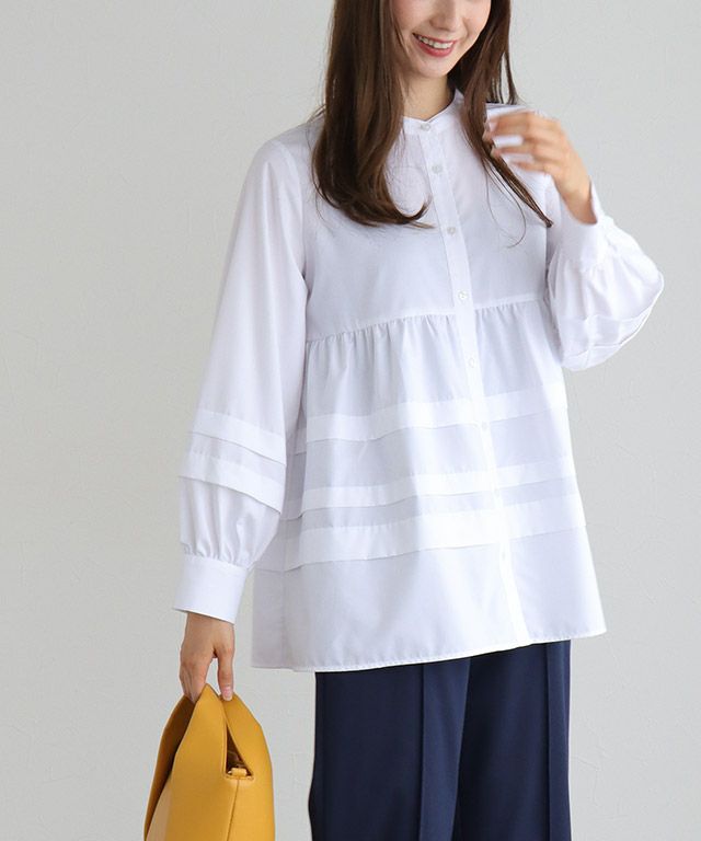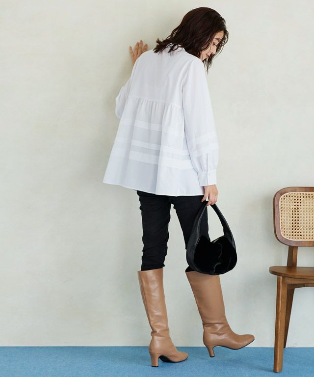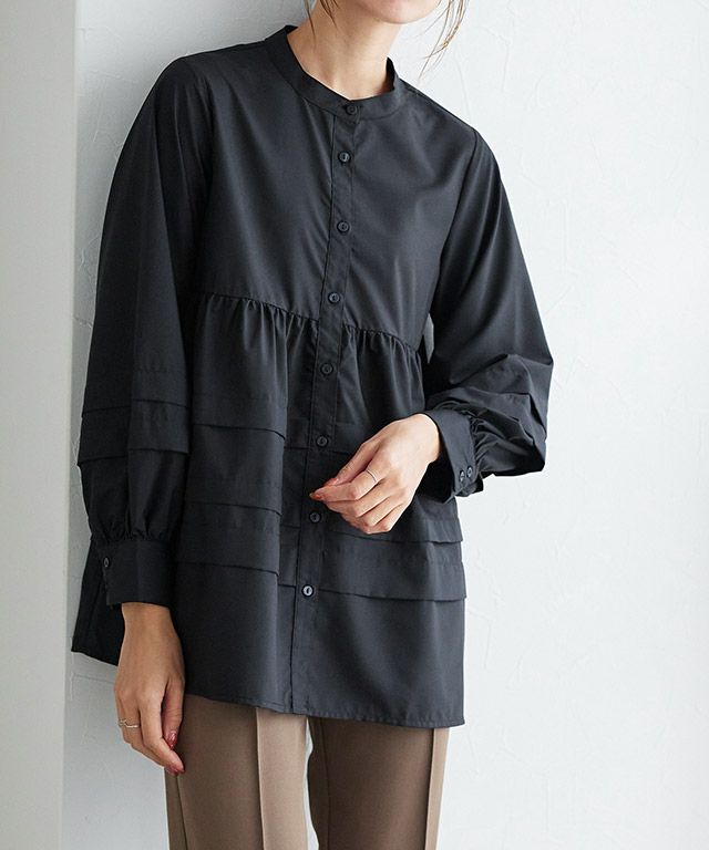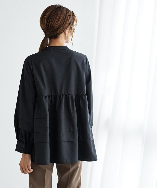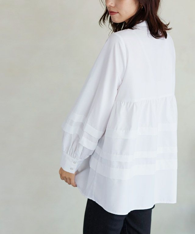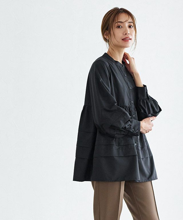 袖と身頃に入れたタックデザインがアクセントになったブラウス。ウエスト切替からのギャザーシルエットとボリュームスリーブを取り入れ、フェミニン要素のあるトレンド感をプラスしました。お尻まで隠れるチュニック丈で体型カバーも叶えられる一枚です。