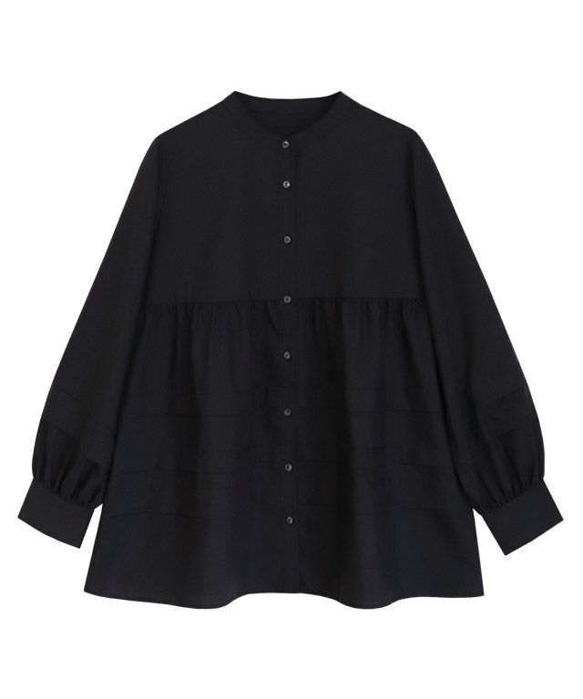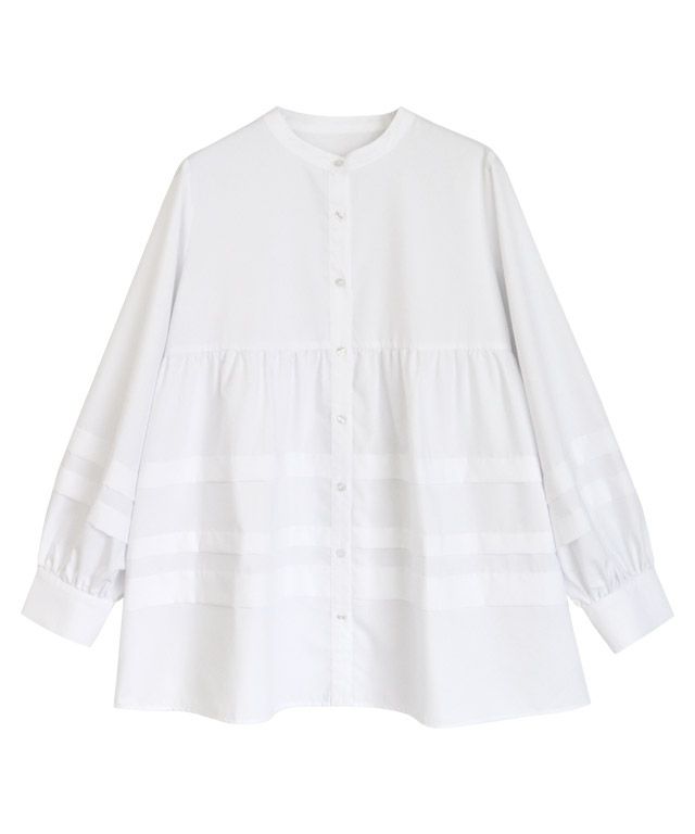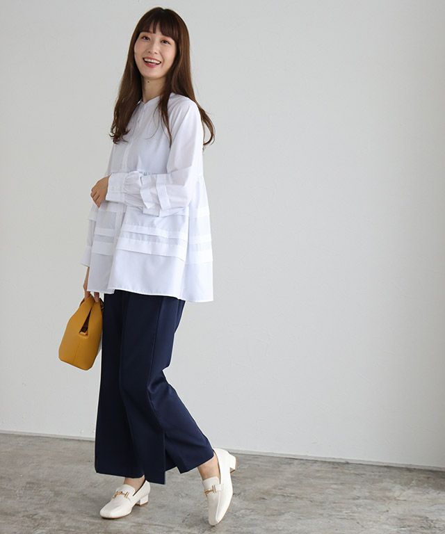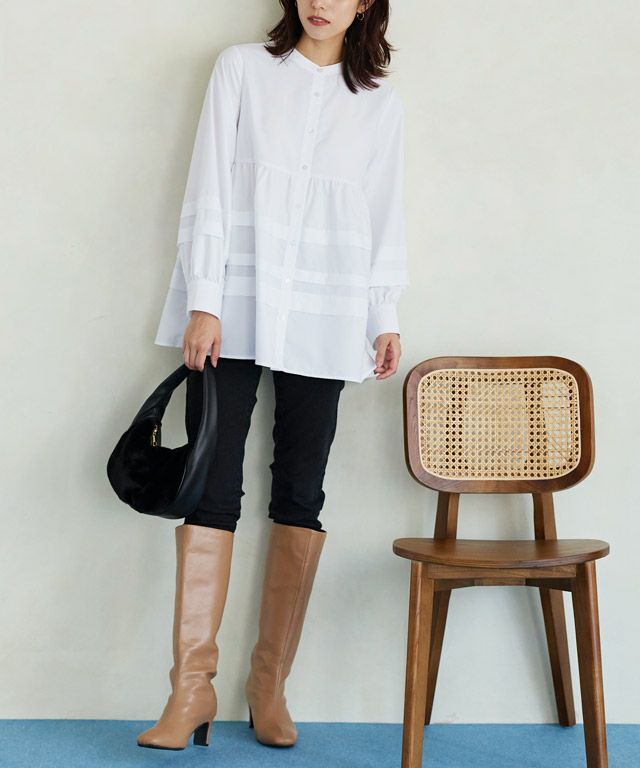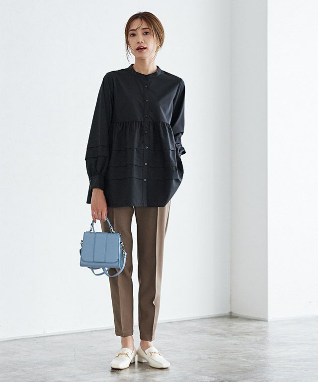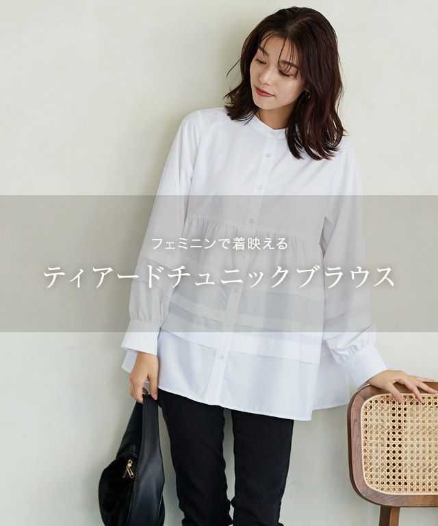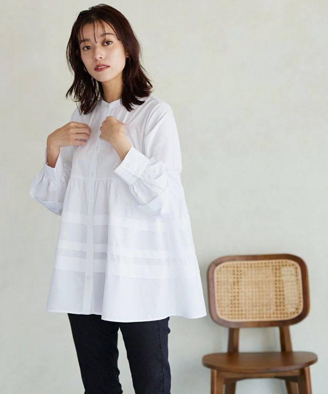 袖と身頃に入れたタックデザインがアクセントになったブラウス。ウエスト切替からのギャザーシルエットとボリュームスリーブを取り入れ、フェミニン要素のあるトレンド感をプラスしました。お尻まで隠れるチュニック丈で体型カバーも叶えられる一枚です。