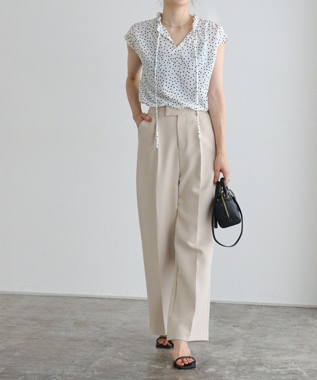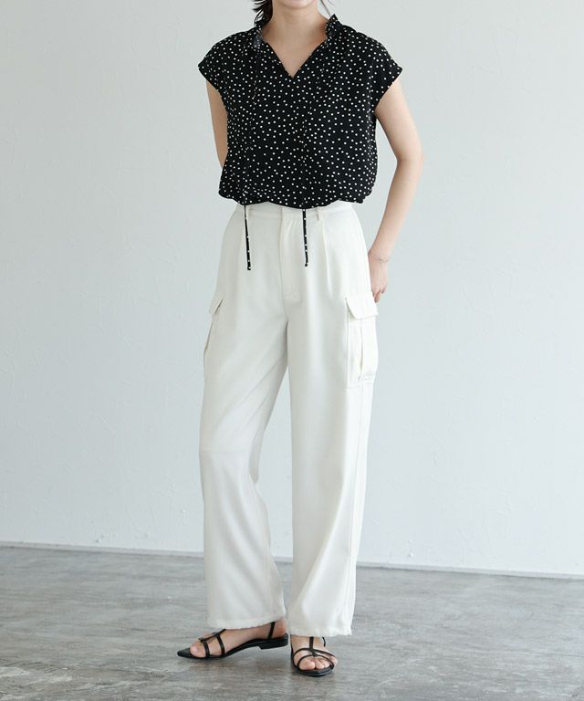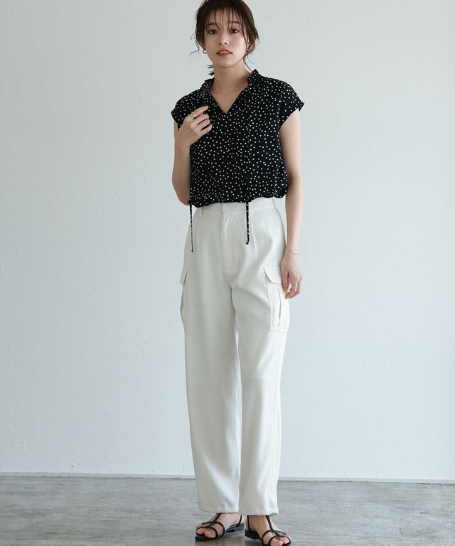カジュアルすぎず合わせやすい小さめドットが、女性らしい雰囲気に。清涼感溢れる薄手の生地が軽やかな印象です。
