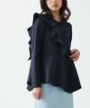 アシンメトリーにあしらったフリルデザインがスタイリングに華やかさとアクセントをプラス。身頃もフレアシルエットにすることで、体型カバーしながらもフェミニン感があるのも魅力です。