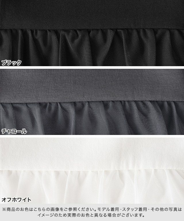 もちっと感と程よいハリ感のポンチ素材はカジュアルになりすぎないのが魅力的。後ろに軽やかなチュール素材をドッキングさせることでトレンドライクな仕上がりに。