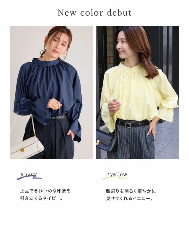 女性らしいキャンディースリーブと、ネックから裾に広がるボリュームシルエットが華やかさを引き立てる一枚。たっぷりのギャザーなので体のラインを拾わず体型カバーしながらオシャレ見えが叶います。デイリーやオフィスシーンにも大活躍◎コーディネート次第でシーズンレスで楽しめる万能ブラウスです。