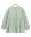 C着丈はお尻が3分の2隠れる丈感でした。袖丈は手首が見える長さです。袖もボリューム感がありゆとりがあります。ティアードデザインなので身幅ゆったりとしています。前後2wayなので着回しがきくのが嬉しいです◎ややハリのある生地です。