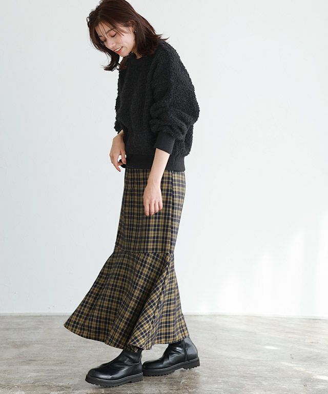 編地に特徴があるのでシルエットはシンプルに仕上げました。ゆったりサイズでルーズさを出しつつ、袖と裾のリブでメリハリのあるシルエットに。丸みのあるコンパクトなシルエットがトレンドライクな印象に仕上げてくれます。