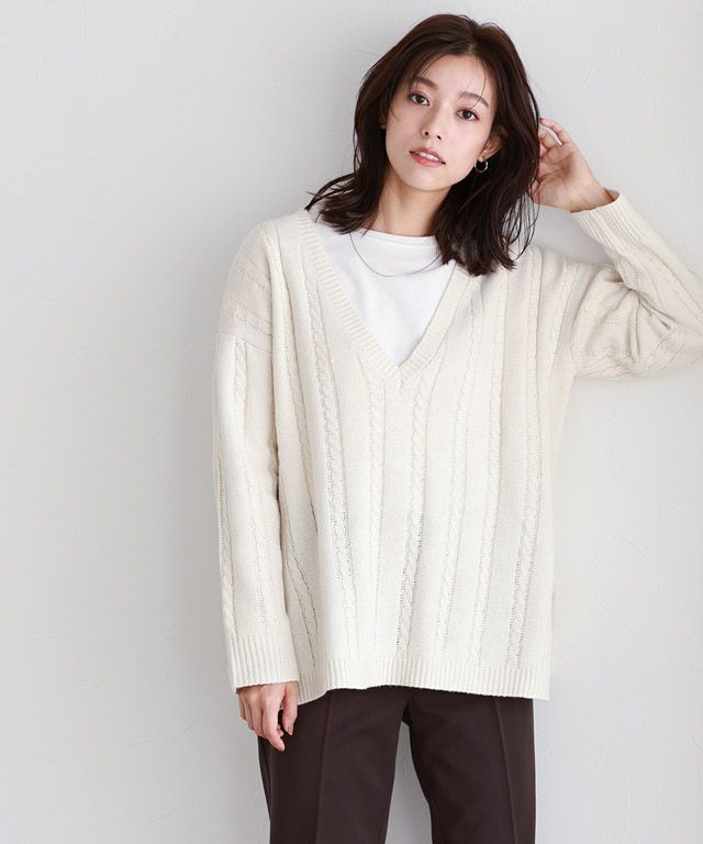 レイヤードスタイルが楽しめる“ケーブル柄深Vネックニット”
