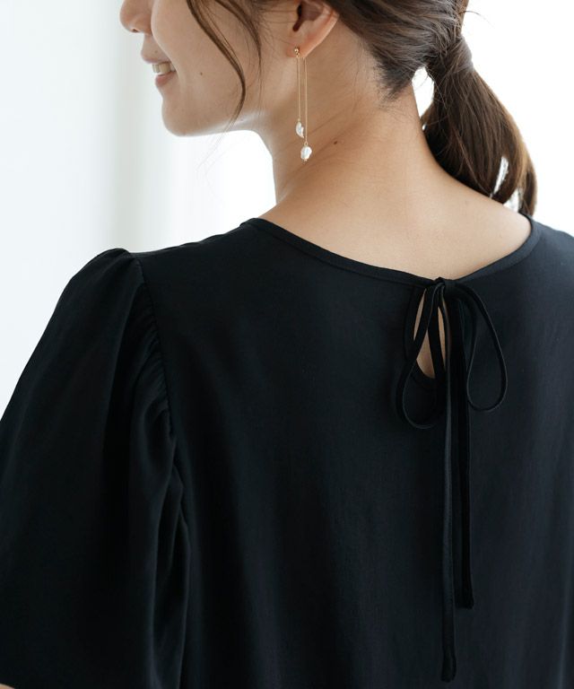 C 着丈はお尻がほとんど隠れる丈感でした。袖丈は二の腕が隠れます。袖口のゴムは程よいフィット感があり、自然とボリュームが出ます◎身幅はゆとりがありました。バックリボンは紐で結べるのでネック周りの広さを少し調整できます。薄手で柔らかくさらっとした生地でした。