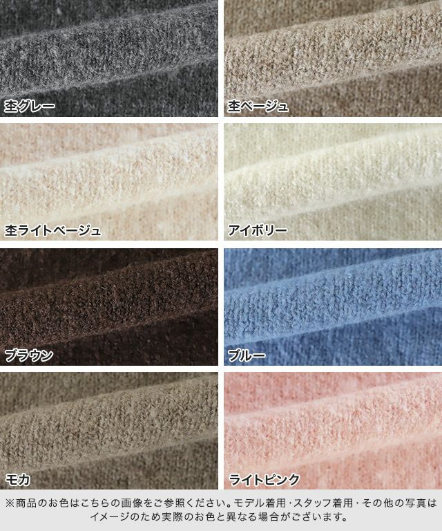 また、ニット製品は生産の過程上「生地を織る際の糸の継ぎ目」繊維の「混紡」、プレス加工、製品洗い加工によって形やサイズ(5cm前後)に誤差が生じる場合がございますが品質上の問題はございません。