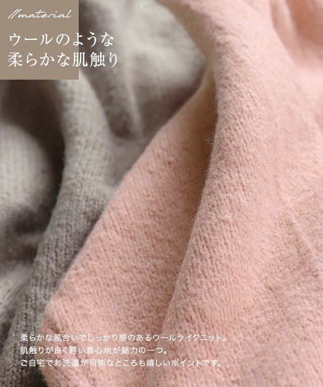 柔らかな風合いでしっかり感のあるウールライクニット。肌触りが良く軽い着心地が魅力の一つ。ご自宅でお洗濯が可能なところも嬉しいポイントです。