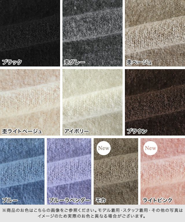 また、ニット製品は生産の過程上「生地を織る際の糸の継ぎ目」繊維の「混紡」、プレス加工、製品洗い加工によって形やサイズ(5cm前後)に誤差が生じる場合がございますが品質上の問題はございません。