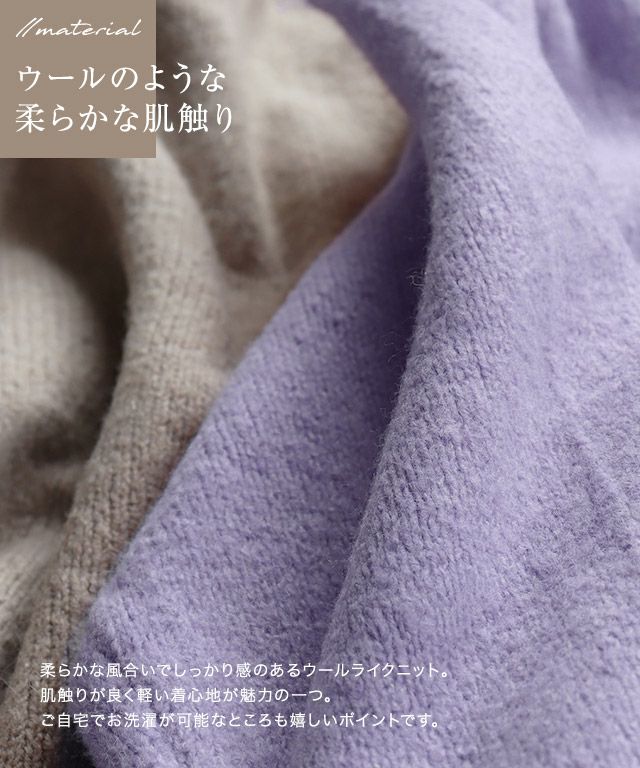 柔らかな風合いでしっかり感のあるウールライクニット。肌触りが良く軽い着心地が魅力の一つ。ご自宅でお洗濯が可能なところも嬉しいポイントです。