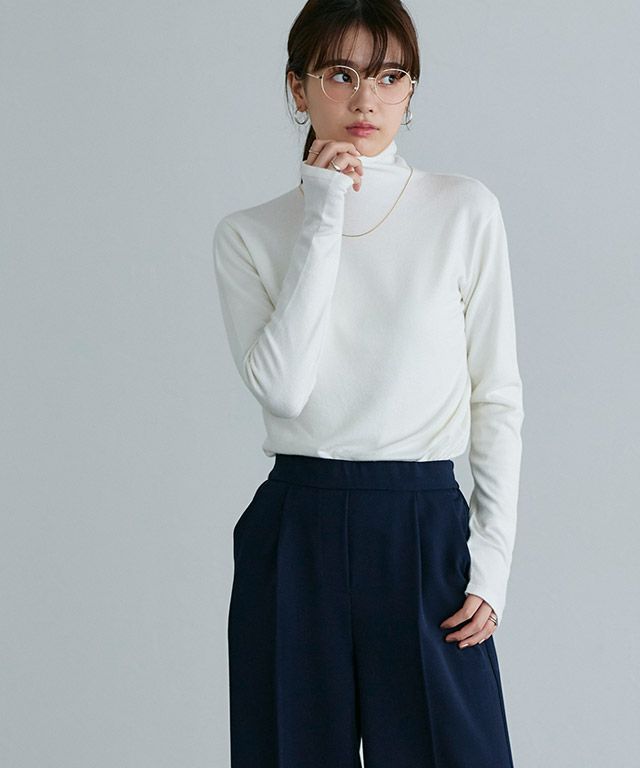 指穴のデザインがトレンドライクな一枚。ハイネックで暖かく、身頃はシンプルなのでジレやベストなどのインナーとしても◎ボトムスを選ばず着回しやすいアイテムです。