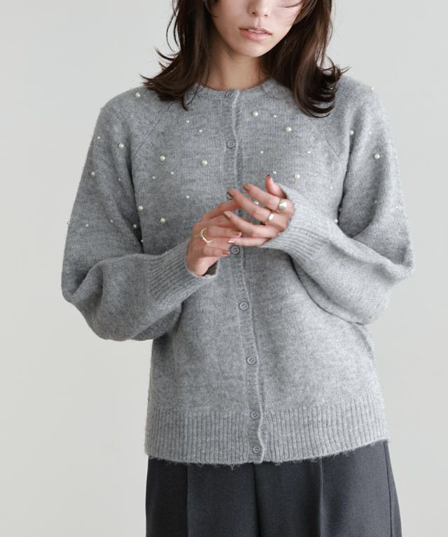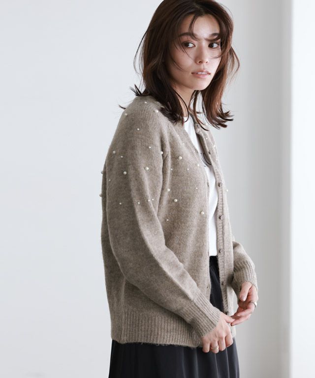 大小ランダムなパールの付いた上品なカーディガン。パール使いがフェミニンな印象をプラスし、スタイリングを華やかに見せてくれます。スカートで女性らしく、デニムであえてカジュアルダウンするなど、幅広く着回せるアイテム。