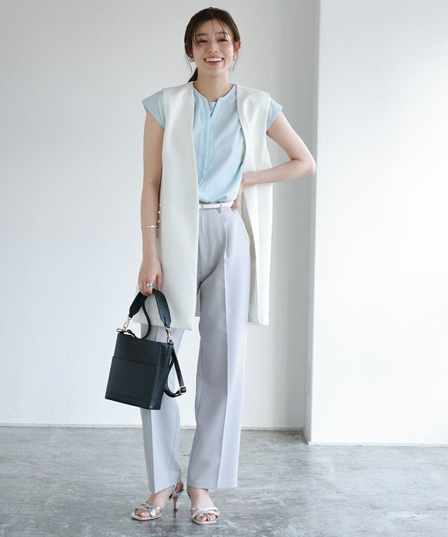 前身頃に施された切り替えラインがこなれたシルエットに。キーネックデザインがデコルテラインをきれいに見せてくれます。パールアクセは取り外しができ、お手入れの際にも安心仕様に。シチュエーションに合わせて取り外してお使いいただけるのもポイント。ON/OFF問わず着用しやすいアイテムです。