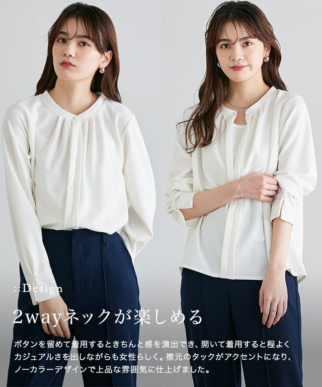 ボタンを留めて着用するときちんと感を演出でき、開いて着用すると程よくカジュアルさを出しながらも女性らしく。襟元のタックデザインがアクセントになり、ノーカラーデザインで上品な雰囲気に仕上げました。