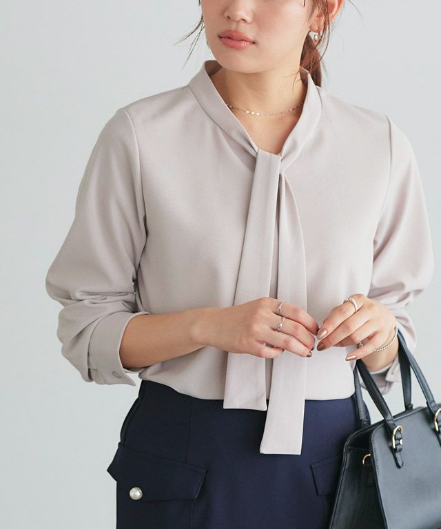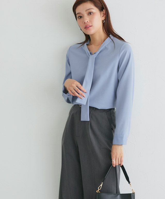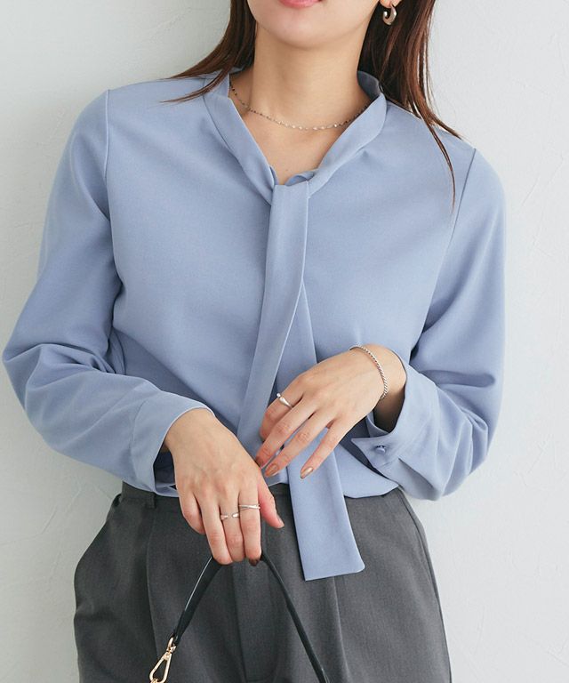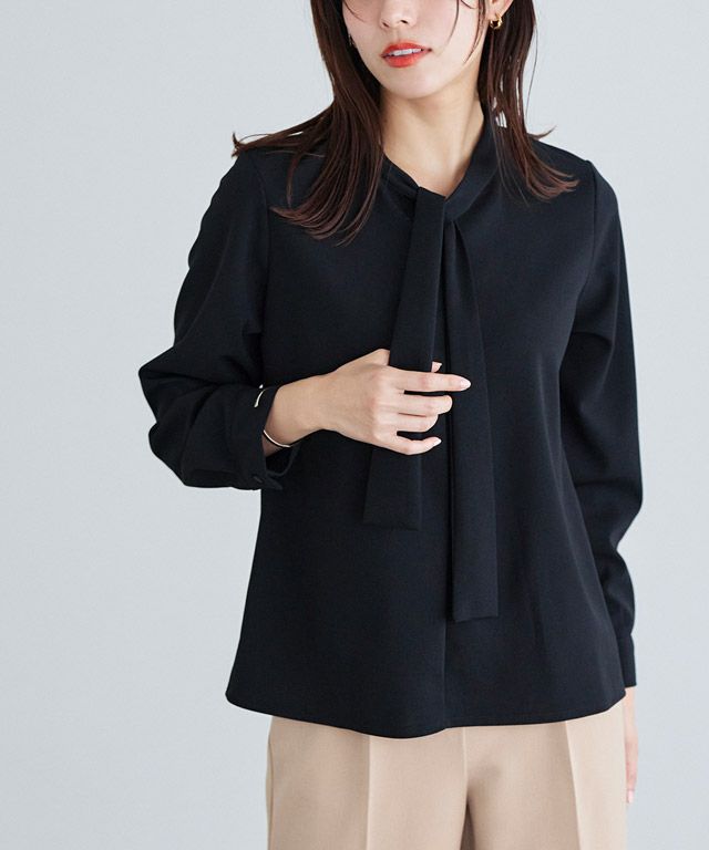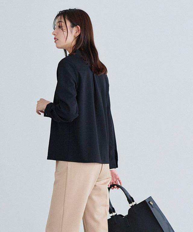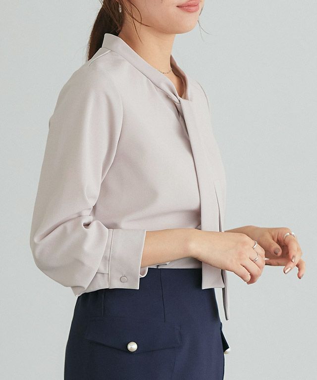 タイデザインがアクセントとなり、コーディネートが広がる一枚。袖口のカフスからタックを施すことで、シンプルなスリーブデザインでもさりげなくアクセントを演出します。