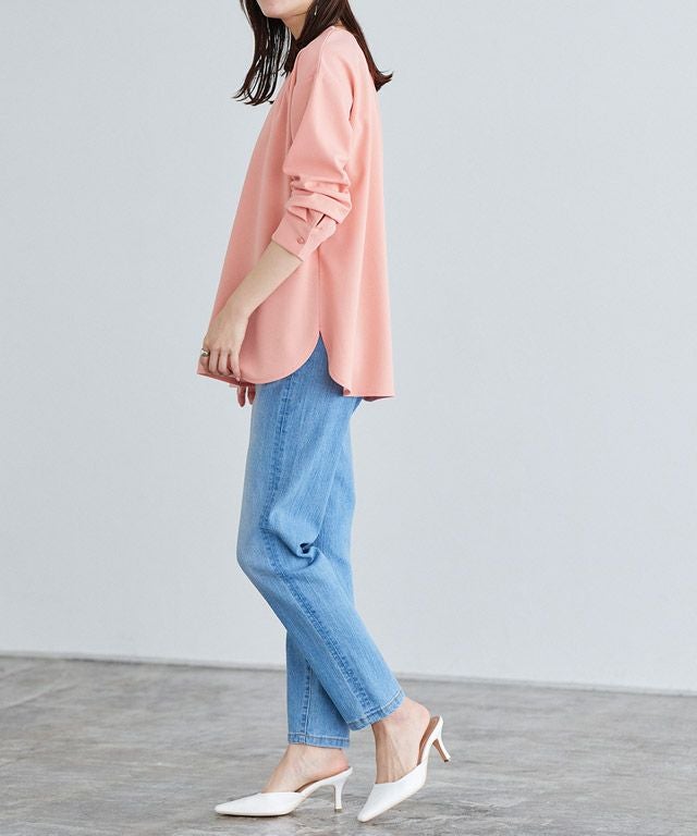 “カットソーなのにブラウス見え”を叶えるカットジョーゼット素材を使用。程良い落ち感がきちんとした印象をプラスします。伸縮性があり、裏面がさらっとした肌触りのブラウス。シワになりにくく、お手入れが簡単なのにキレイ見えするところも魅力の一つです。