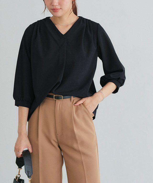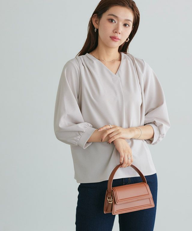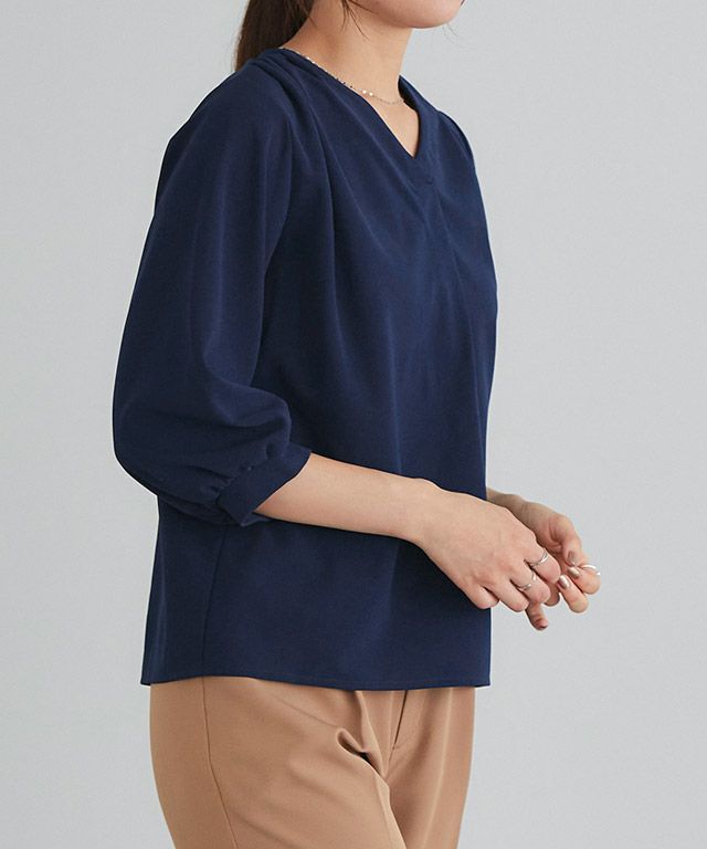 首元をすっきりと見せてくれるVネック。肩部分に施したタックで のっぺりせず、大人な雰囲気に◎ボリュームのある袖でフェミニンさを プラスしつつ七分袖で抜け感を演出した一枚に仕上げました。