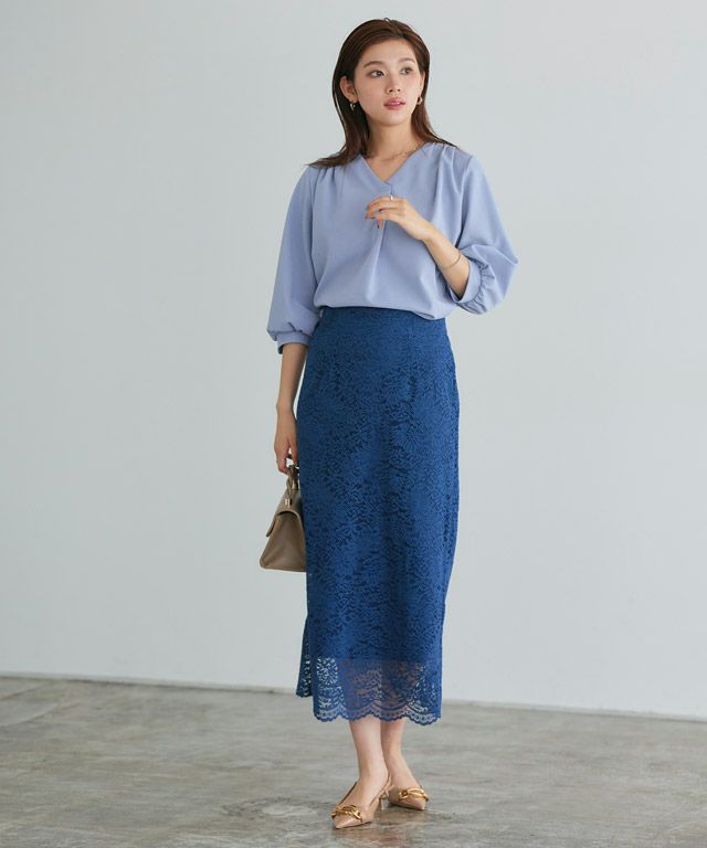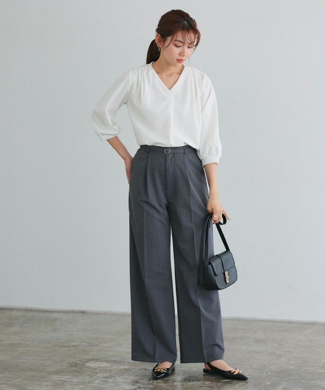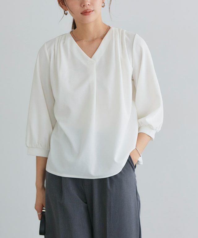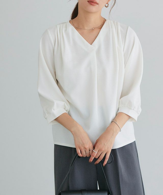 首元をすっきりと見せてくれるVネック。肩部分に施したタックで のっぺりせず、大人な雰囲気に◎ボリュームのある袖でフェミニンさを プラスしつつ七分袖で抜け感を演出した一枚に仕上げました。