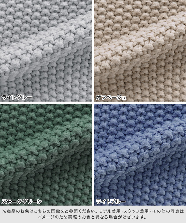 また、ニット製品は生産の過程上「生地を織る際の糸の継ぎ目」繊維の「混紡」、プレス加工、製品洗い加工によって形やサイズ(5cm前後)に誤差が生じる場合がございますが品質上の問題はございません。
