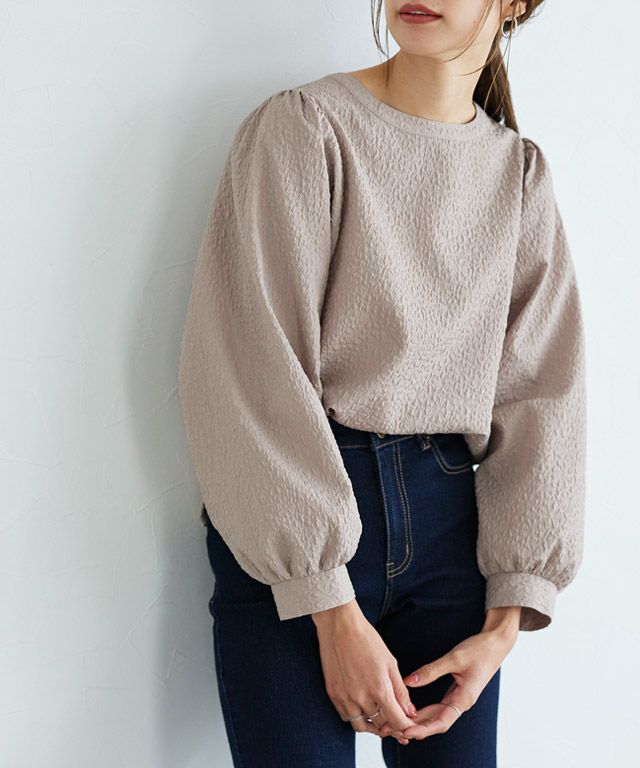 シンプルなクルーネックとボタンデザインの前後2wayで着られるデザイン。たっぷりとしたボリューム袖がトレンド感があり、フェミニンな印象に仕上げてくれます。同素材のスカートとセットアップでの着用もおすすめです。