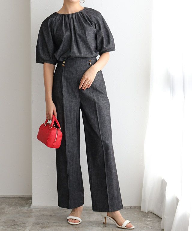 襟元のギャザーと、立体的なボリュームのある構築袖がトレンド感がありながら女性らしい雰囲気に。きれいめパンツに合わせて上品に魅せたり、デニムONデニムでカジュアルに着こなすのも◎同素材のパンツとセットアップでの着用も可能です。