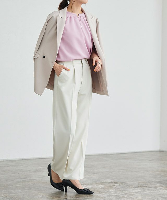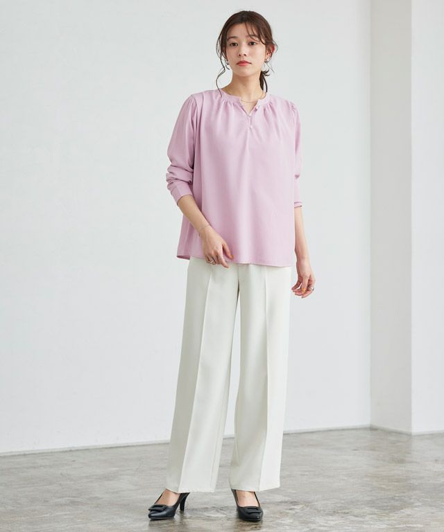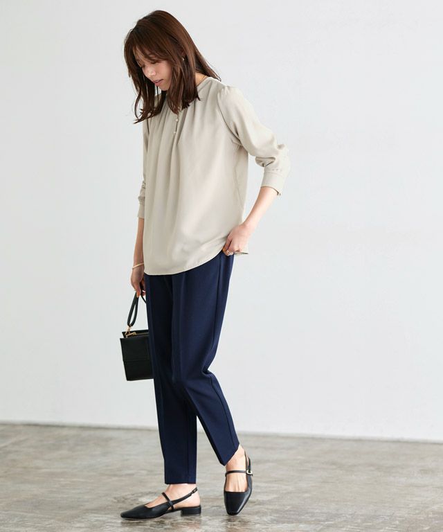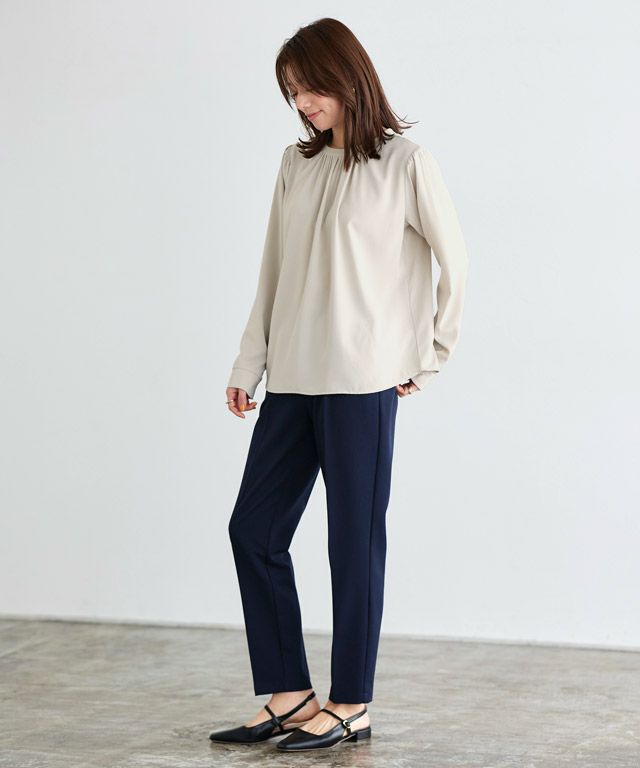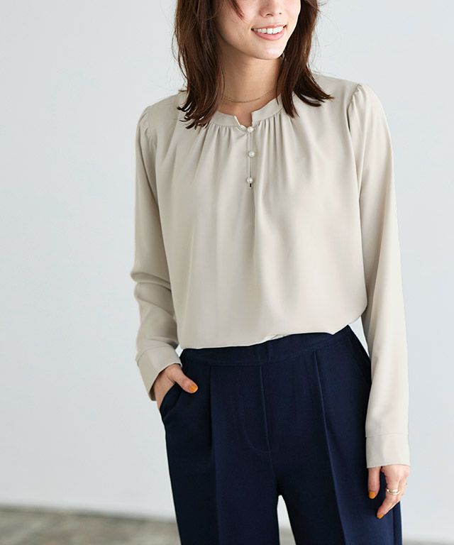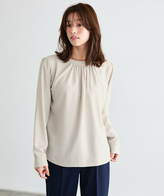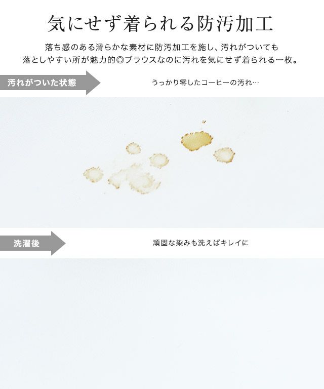 落ち感のある滑らかな素材に防汚加工を施し、汚れがついても落としやすい所が魅力的◎ブラウスなのに気にせず、長く着れる一枚。